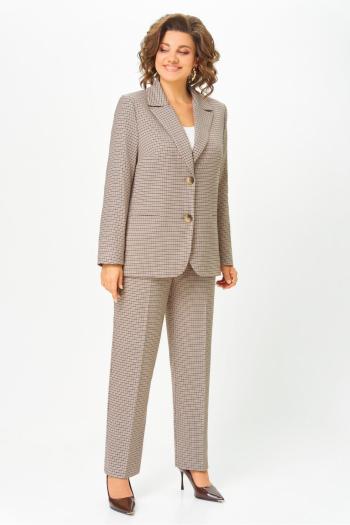 Брюки на эластичном поясе, с боковыми наклонными карманами и стрелками на передних половинках. Жакет упрямлённого силуэта с заниженной линией плеча, рубашечным рукавом, центральной застёжкой на тесьму-молнию и капюшоном. Полочка с вертикальными рельефами и двойной центральной отделочной деталью.