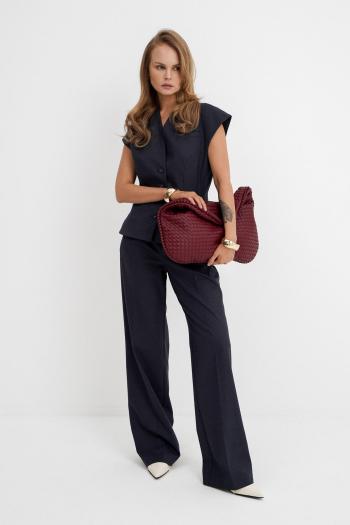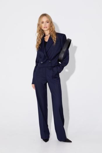 Свободный жакет упрямлённого силуэта, втачного покроя с центральной застёжкой и классическим английским воротником. Полочка с отрезным бочком, нагрудной выточкой и прорезным карманам с клапаном. Спинка с центральным швом и плечевой вытачкой. Рукав двухшовный с отлётной шлицей и отделочными пуговицами. Брюки в мужском стиле со стрелками, мягкими складками на передних половинках, вытачками - на задних. По переду наклонные боковые карманы. На з.п. - прорезные листочки. Пояс приточной с настрочными шлёвками, застёгивающийся на крючок.