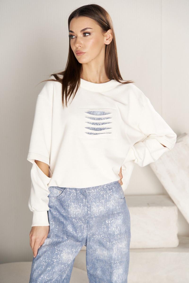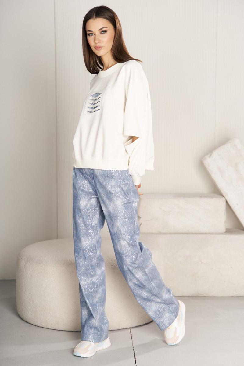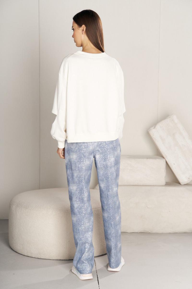 Комплект женский 2-х предметный. Свитшот свободного силуэта, с заниженной линией плеча, рукавом, расширенным в области оката, дизайнерской вставкой на полочке. Рукав двухшовный с поперечным подрезом на передней части. Длина рукава с плечом около 74 см. Джинсы высокой посадки с серебристым напылением с классическими 5-ю карманами. Задние половинки с отрезными кокетками и вытачкой от бокового шва. Длина брюк около 105 см