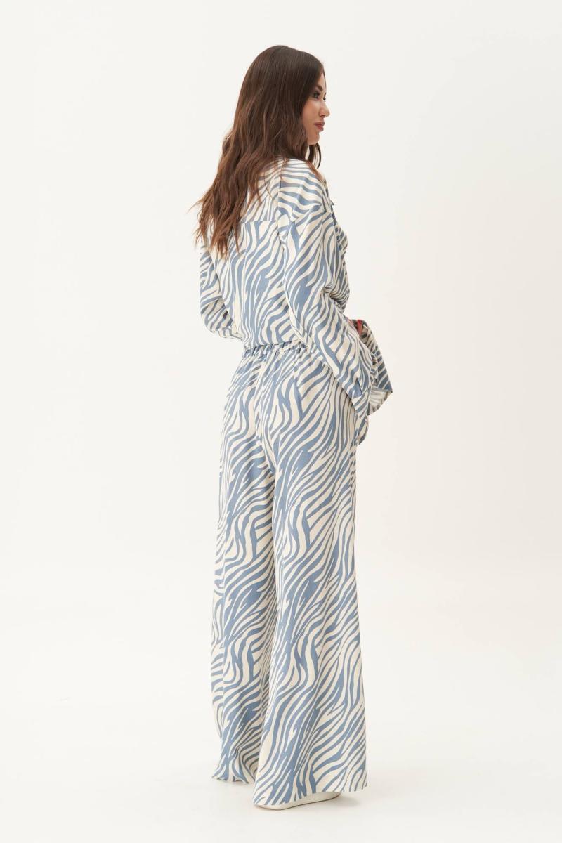 Прежде всего, его выделяет роскошная ткань с принтом animal, которая позволяет создать такой великолепный вариант брючного комплекта, который составит конкуренцию любому платью.
