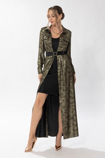 Свободный упрямленный силуэт, рубашечный покрой, круглая горловина и притачной пояс по низу. По низку рукава-расширенная манжета. На полочке и спинке-авторский принт.