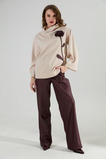 Комплект из джемпера и брюк. Джемпер свободного силуэта из трикотажной ткани с принтом. Рукав втачной одношовный со складками по низу и манжетой. Горловина обработана планкой. По переду поверх принта настрочена сетка с бархатным рисунком. Брюки расширеные книзу с притачным поясом. Спереди застежка гульфик на молнии и петлей и пуговицей по поясу. По задней частям брюк вытачки. Пояс срезинкой в боковых частях. Брюки с заутюженными стрелками. Длина джемпера - 66 см, длина рукава джемпера - 53 см, длина брюк с учетом пояса - 109 см.