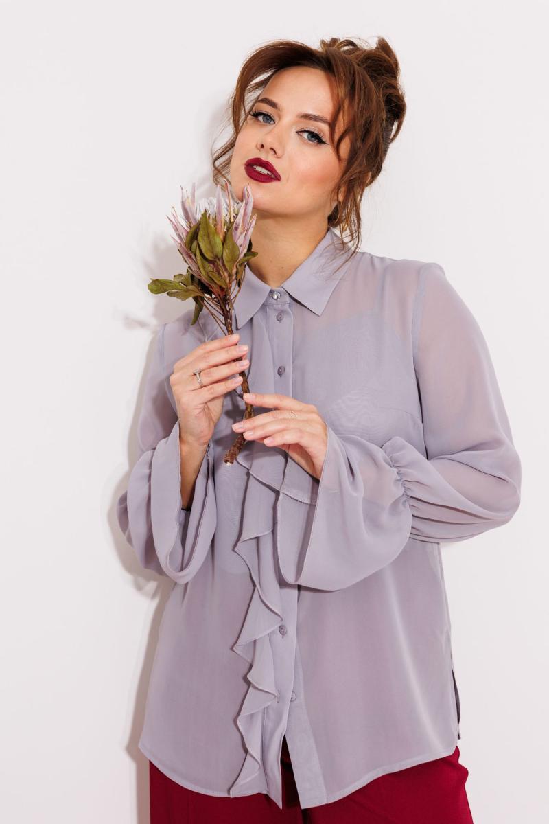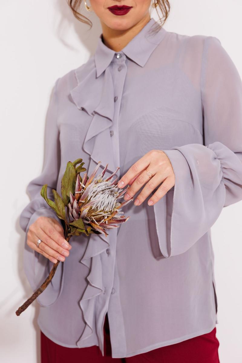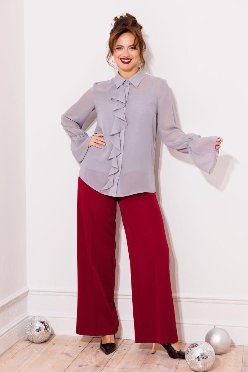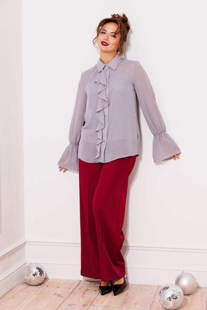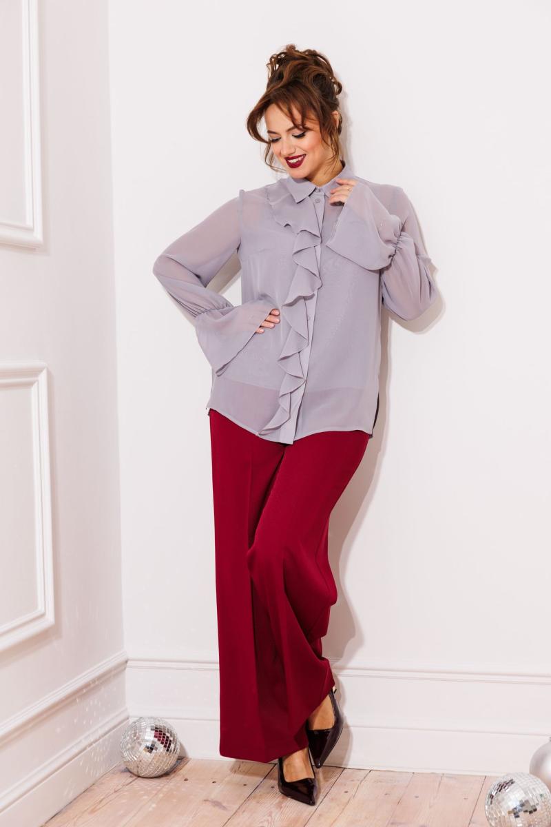 Блузка свободного силуэта выполнена из шифона. Перед с нагрудной вытачкой. Застежка центральная с отрезной планкой на петли и пуговицы. Воротник со стойкой. В правой части переда в планку вставлена рюша. Рукав втачной одношовный со сборкой на резинку в нижней части с образованием волана. В боковых швах разрезы. Пуговица на стойке декоративная. К блузке прилагается топ из того же шифона на регулируемых бретльках. Брюки расширеные книзу с притачным поясом. Спереди застежка гульфик на молнии и петлей и пуговицей по поясу. По задней частям брюк вытачки. Пояс срезинкой в боковых частях. Брюки с заутюженными стрелками. Длина блузки - 68 см, длин рукава блузки - 64 см, длина топа - 38 см, длина брюк с учетом пояса -109 см.