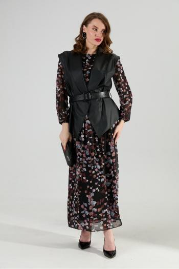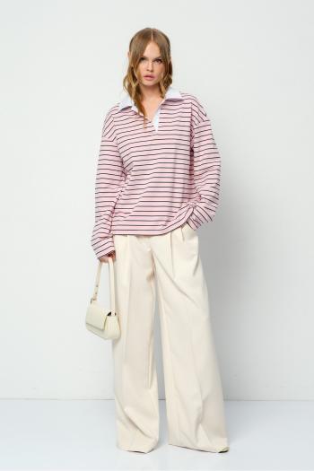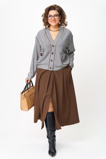 Костюм состоит из блузки и брюк. Блузка оригинальная приталенного силуэта из вельветовой ткани. Перед с подрезом под грудью, сборкой в районе груди и талиевыми вытачками. Затсежка на петли и пуговицы. Горловина V-образной формы. Спинка со средним швом и талиевыми вытачками. Рукав втачной со сборкой по окату и с манжетой по низу. Манжета высокая с двумя петлями и пуговицами. Длина блузки - 63 см, длина рукава блузки - 64 см. Брюки палаццо с притачным поясом из мягкой вельветовой ткани. Спереди застежка гульфик на молнии и петлей и пуговицей по поясу. По задней частям брюк вытачки. Пояс с резинкой в боковых частях. Брюки с заутюженными стрелками. Длина брюк с учетом пояса - 109 см.