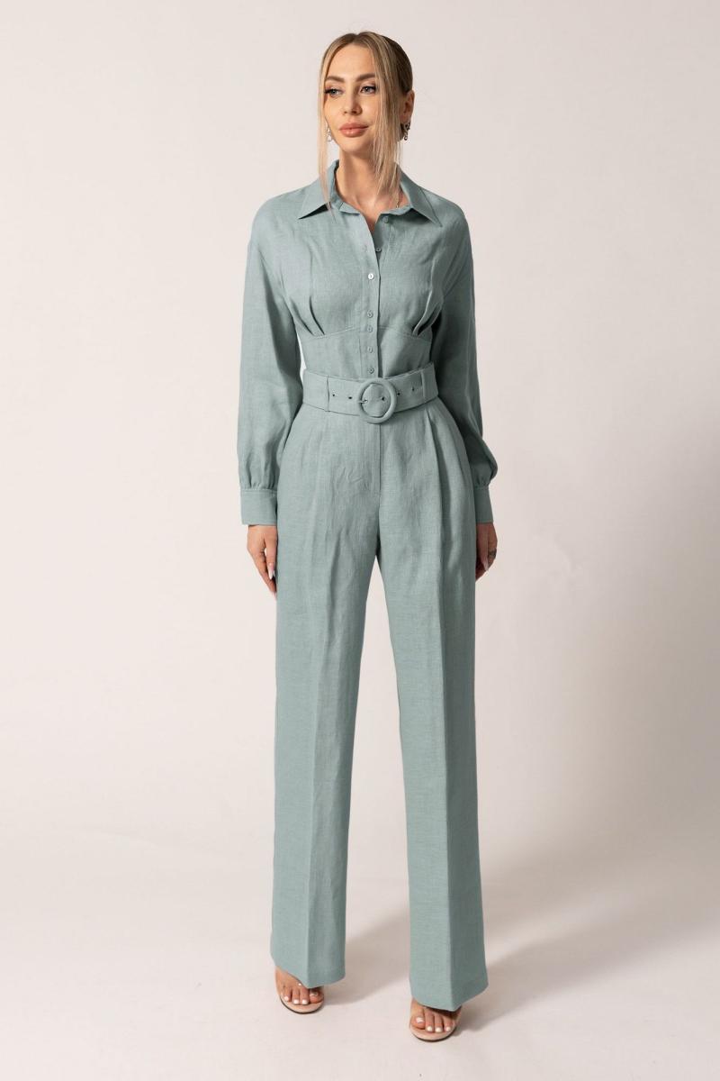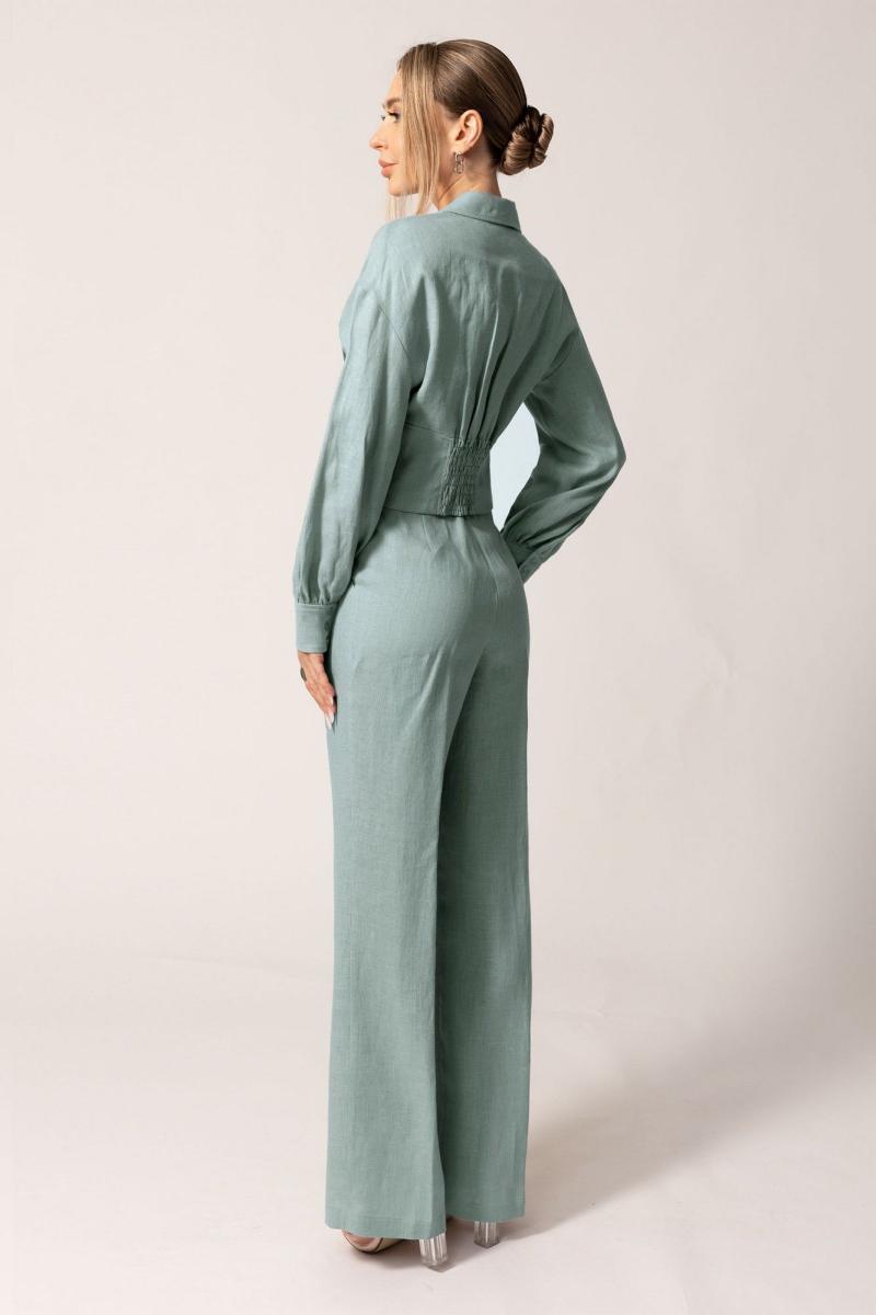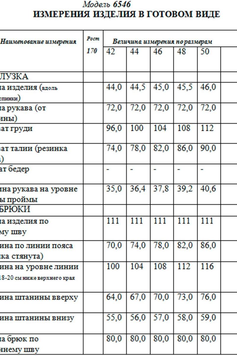 Блузка с центральной застежкой на петли и пуговицы, с втачным воротником и отрезной стойкой. По низу блузки отрезной пояс фигурной формы, по центру спинки пояс присборен. Лиф полочек с двумя односторонними складками. Плечо спущенное, рукав втачной, длинный, с отрезной манжетой. По шву притачивания манжеты рукав присборен. Брюки прямые, с отрезным поясом, по спинке пояс присборен на резинку. На передних половинках две односторонние складки и карманы. Вход в карман наклонный к боковому шву. Застежка- гульфик.