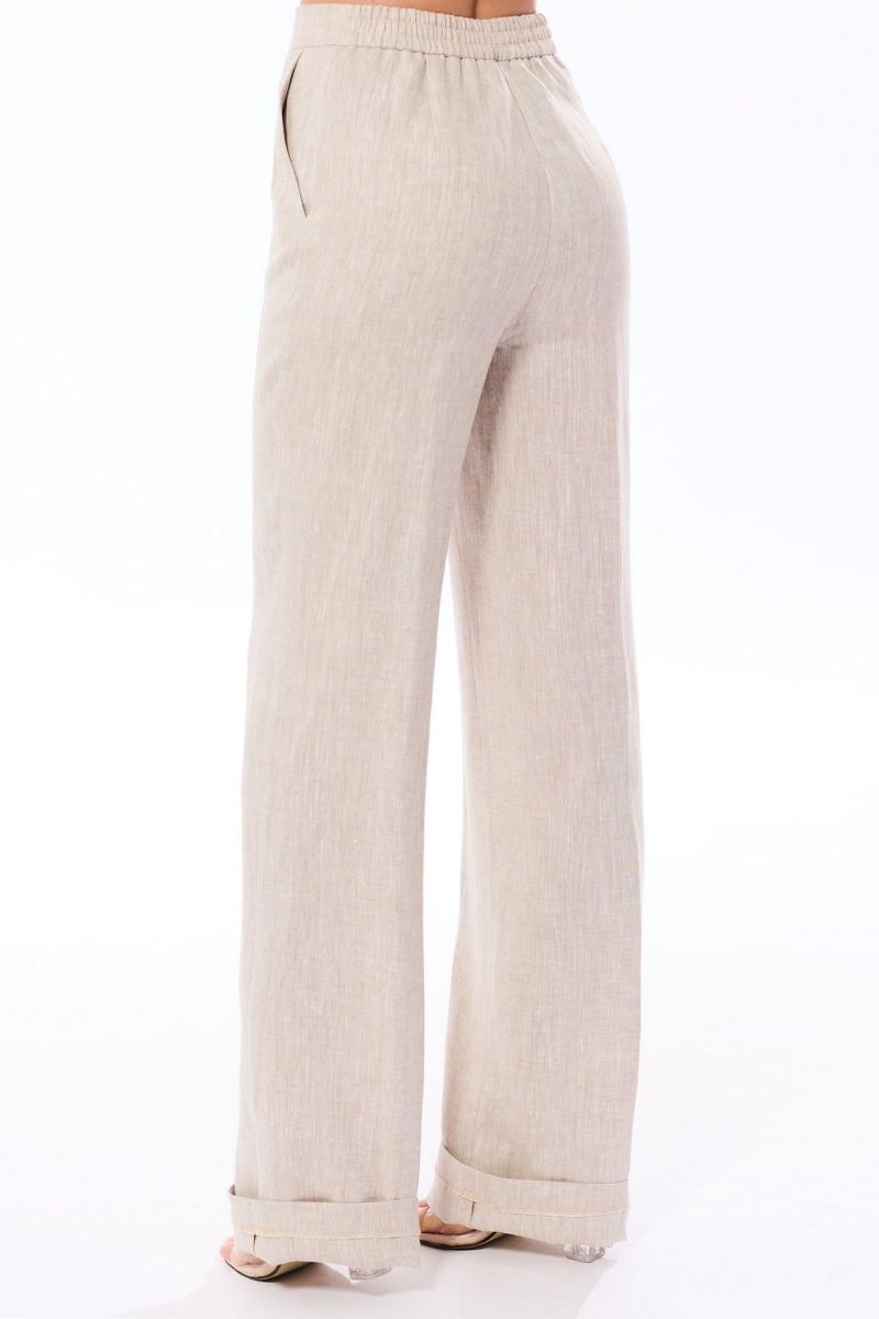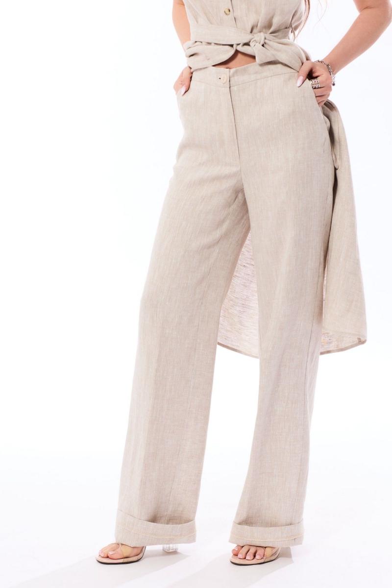 Туника с центральной застежкой на петли и пуговицы, втачным воротником с отрезной стойкой. По переду нагрудные вытачки и клапаны, расположенные на уровне груди. Спинка с отрезной кокеткой. По проймам- втачные крылышки, зафиксированные к плечевому шву патой с петлей и пуговицей. На боковых швах расположены шлевки и съемный пояс. Брюки- с отрезным поясом. По спинке пояс присборен на резинку. По боковым швам расположены карманы. Вход в карман наклонный к боковому шву. Застежка гульфик. Комплект со съемным поясом.