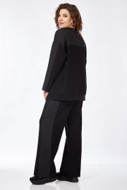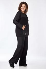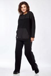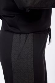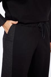 Костюм женский, брючный, комбинированный: трикотажное полотно и ткань с эффектом стежки. Джемпер свободного кроя. По переду кокетка с обработанной застежкой на кнопки. Горловина круглой формы. Обработан накладкой карман — кенгуру, декорирован нашивкой с полукольцом. По низу трикотажная планка. На спинке обработана кокетка. Рукава спущенные, со вставкой, длинные. Брюки прямого кроя. Пояс на резинке с втянутым шнуром. Обработаны боковые карманы на отделочных деталях брюк.