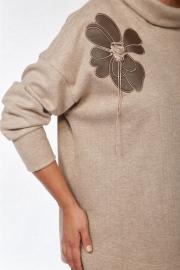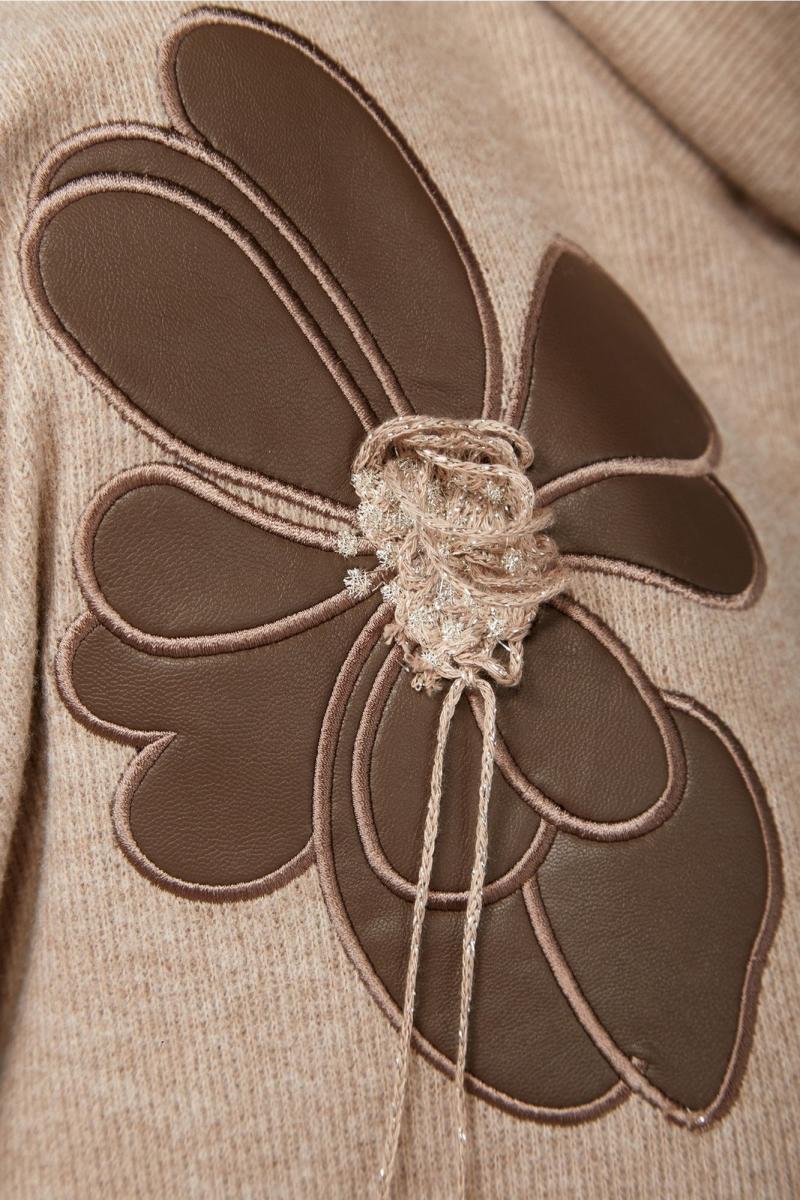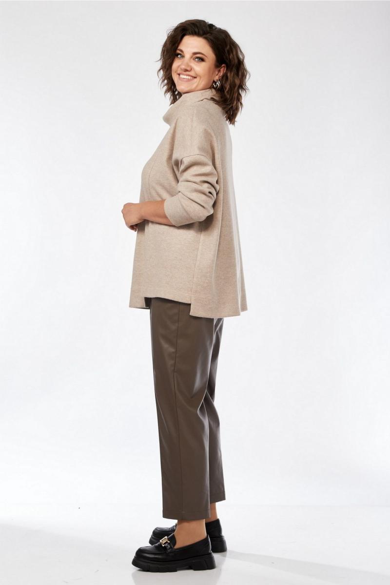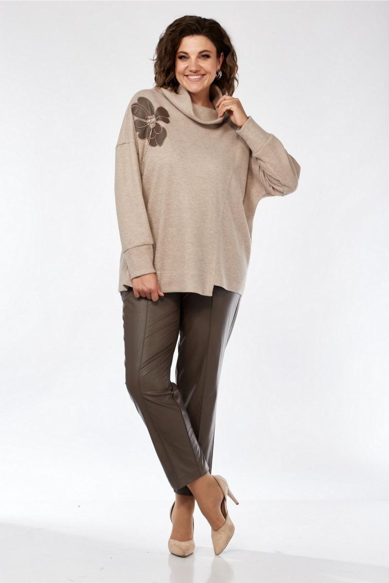 Комплект женский брючный. Джемпер свободного кроя, изготовлен из трикотажного полотна. Перед разрезной с фигурным низом. Горловина обработана воротником -хомут. Спинка цельнокроеная. Декором служит вышивка — аппликация. Брюки женские, средней посадки выполнены из экокожи. Обработаны боковые карманы. Пояс на резинке. На передних деталях брюк застрочен кант