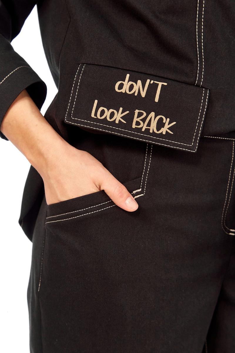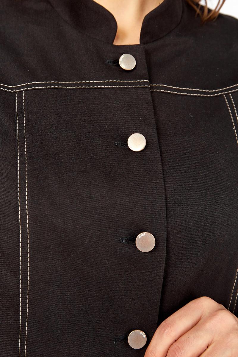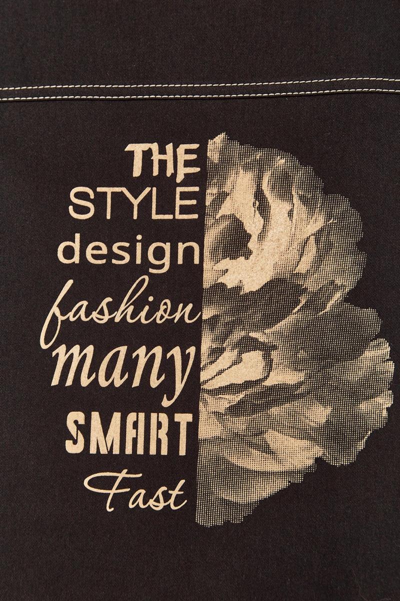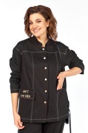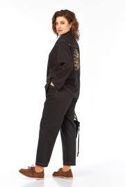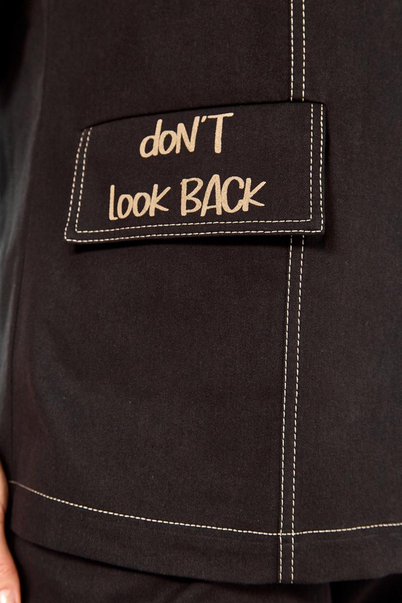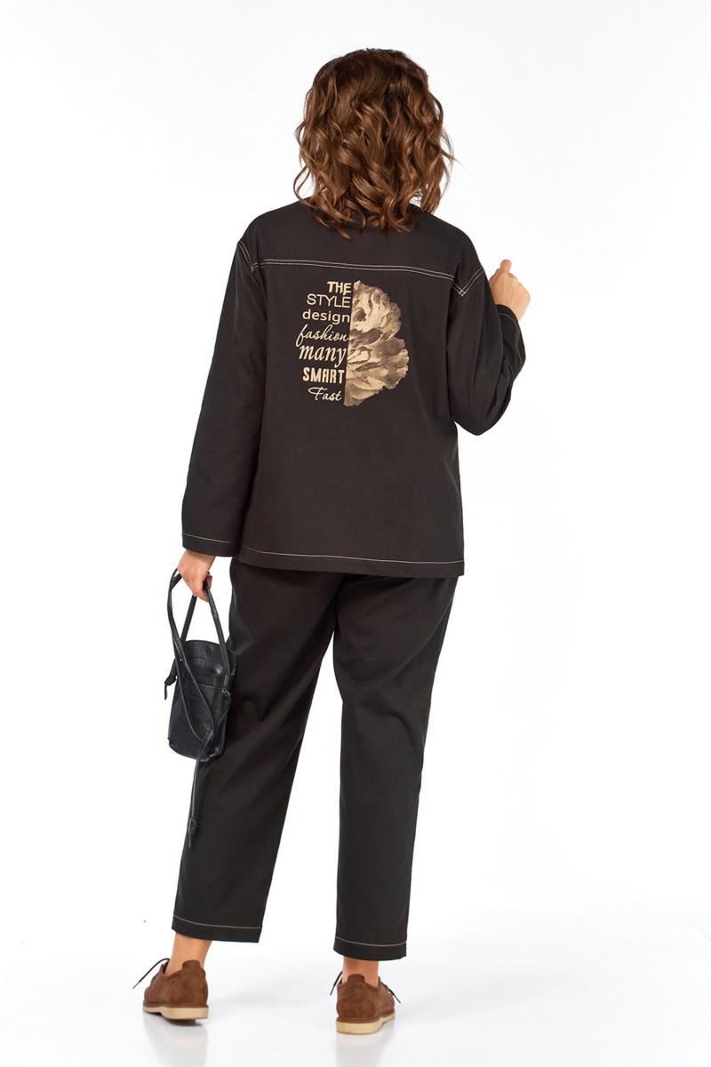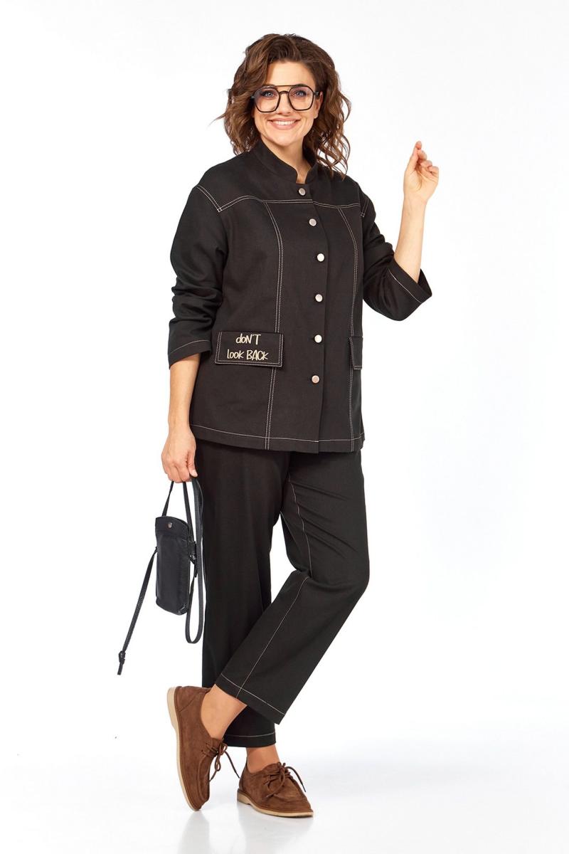 Костюм брючный двухпредметный, состоит из жакета и брюк, выполнен из ткани костюмно-плательного ассортимента. Жакет прямого силуэта. Горловина обработана воротником — стойка, застежка центрально — бортовая на петли и пробивные пуговицы. Перед с кокетками и рельефами выходящими из них. Имеются прорезные карманы с клапаном. Спинка на кокетке. Рукава рубашечного типа. Жакет дополнен печатью. Брюки свободного силуэта слегка заужены к низу. Пояс притачной, частично на эластичной тесьме, с застежкой на петлю и пробивную пуговицу. По переду обработаны карманы с листочкой и подрезным бочком. Вдоль швов костюма проходят контрастные строчки из отделочных ниток.