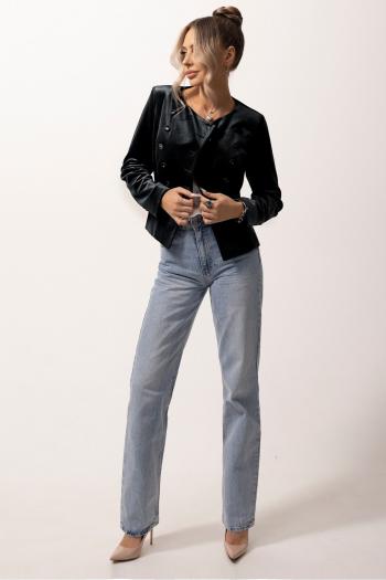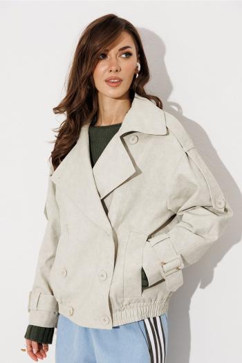Жакет двубортный с центральной застежкой на 2 петли и 2 пуговицы, с воротником-стойкой. По переду обработаны рельефы, карманы с листочкой. Спинка разрезная. Рукав длинный, двухшовный, с имитацией шлицы декорированной пуговицами. Брюки женские, расширенные. По переду обработана застежка на молнию, обработаны карманы с наклонным входом, заутюжены стрелки. На задних половинках брюк застрочены вытачки, заутюжены стрелки. Верх обработан широким притачным поясом (частично на резинке), застегивающимся на петлю и пуговицу.
