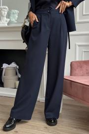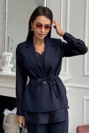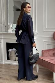 Костюм женский, состоящий из жакета-блузы и брюк. Жакет выполнен из двух видов ткани, перед двухслойный. Верх отлетной, выполнен из костюмной ткани с подкладкой. Перед жакета – с центральной бортовой застежкой на петлю и пуговицу, слева карман с листочкой (нефункциональный), вертикальные вытачки. Горловина обработана воротником пиджачного типа. Нижний слой выполнен из блузочной ткани. Перед блузки с центральной застежкой, обработаны вытачки нагрудные и отстрочная планка, которая застегивается на петли и пуговицы. Горловина блузки V – образной формы. Спинка с двойной кокеткой из костюмной ткани, нижняя часть спинки с центральной складкой, выполнена из блузочной ткани. Рукав втачной одношовный из блузочной ткани, по низу обработан широкой притачной манжетой, застегивающейся на петли и пуговицы. Низ фигурный. В боковых швах вставлены шлевки для пояса (поясом комплектуется). Брюки женские прямого силуэта. По переду обработана застежка на молнию. По задним половинкам брюк застрочены вытачки. В боковых швах обработаны боковые карманы. Пояс притачной, по переду с застежкой на пуговицу, по задней части на резинке. Декоративные элементы и фурнитура могут отличаться от заявленных на фото. Цвет материала может отличаться по тону в зависимости от настроек вашего устройства!