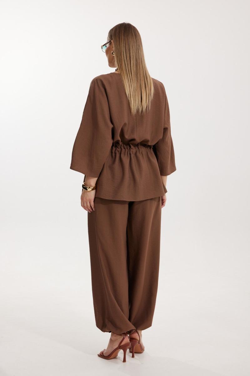 Костюм женский, состоящий из блузы и брюк. Блуза кроя «летучая мышь» длиной за линию бедра. Перед цельный с округлой горловиной. Спинка со средним швом. В районе талии обработана кулиса с широким поясом. По низу рукава по передней части выполнено несколько рядов сборки. Горловина обработана окантовкой. Брюки прямого силуэта с поясом на резинке. По передним половинкам заложены складки и обработаны наклонные карманы с отрезным бочком По низу брюки собраны на резинку. Верхний срез брюк обработан отрезным поясом на частичной резинке.
