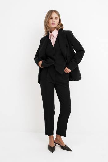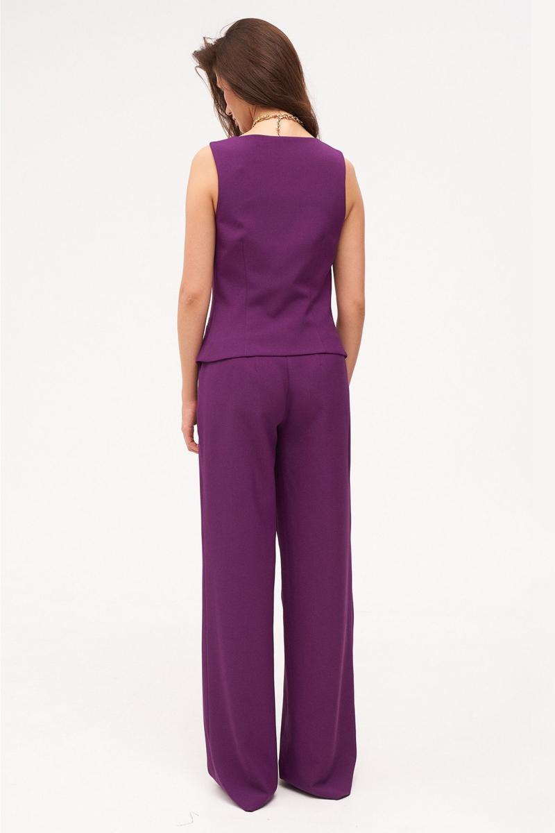 Спинка с талиевыми вытачками. Жилетка на притачной подкладке. Застежка центральная, на прорезные петли и пуговицы. Длина жилетки до уровня линии бедер. Брюки женские большого объема, прямого силуэта, вида «палаццо». На передних половинках брюк по линии талии заложены две
