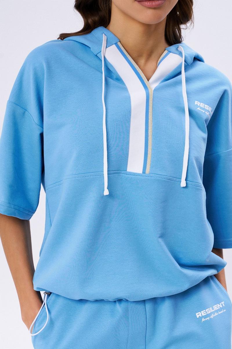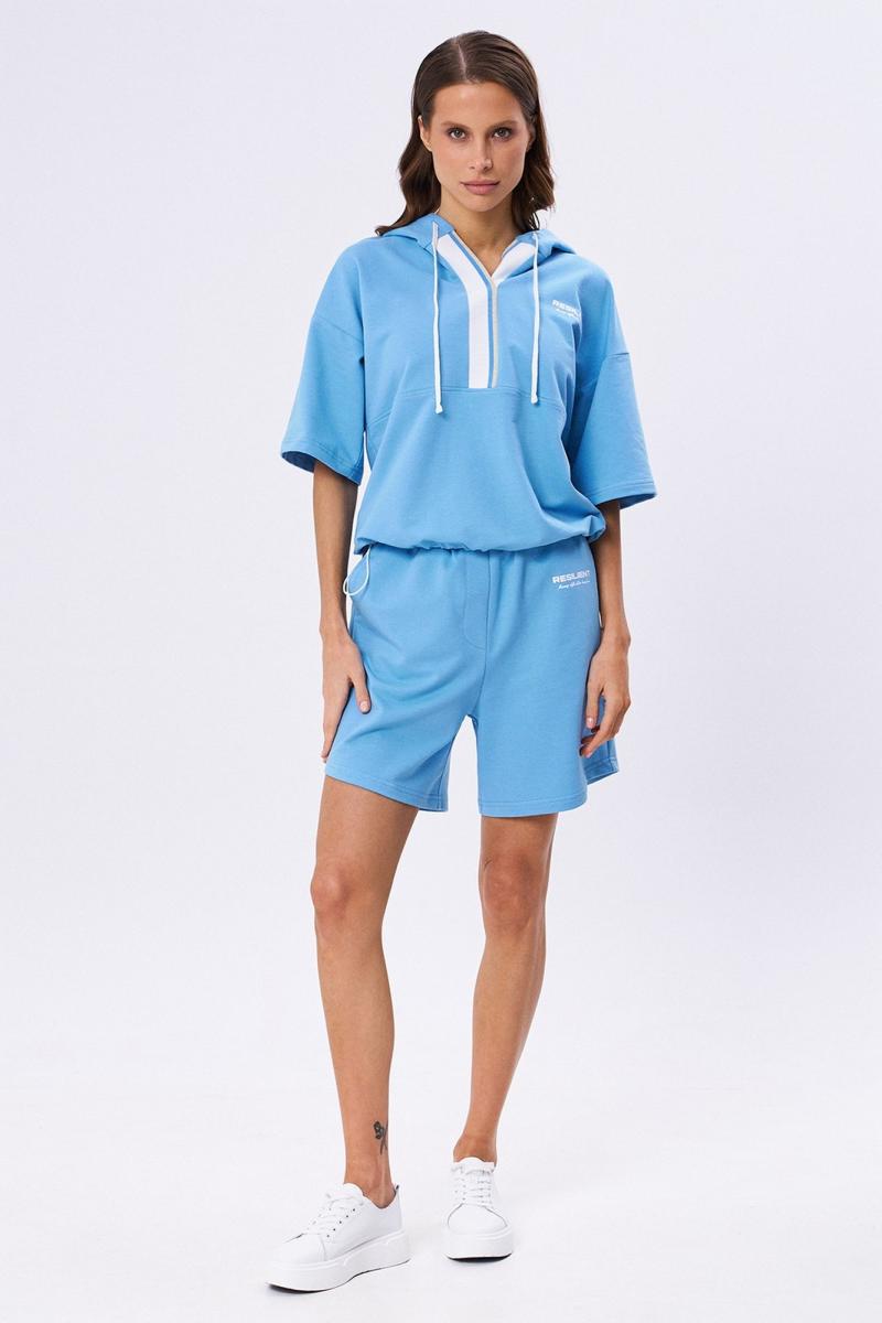 Комплект из футера 2-х нитки, состоящий из джемпера и шортов. Объёмный джемпер с капюшоном, спущенной линией плеча и рукавом до локтя. Вырез горловины отделан эластичным довязом в полоску. Низ изделия на кулисе со шнуром и фиксаторами. На груди контрастная печать. Шорты с фигурным низом. Пояс на резинке со шнуром . По бокам карманы. Спереди контрастная печать.