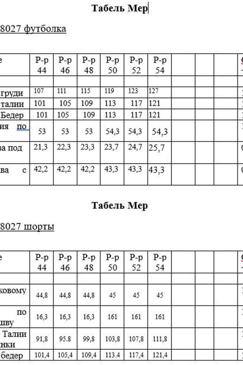 Таблица размеров