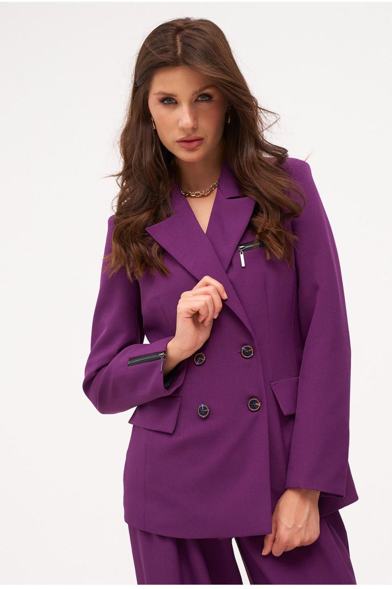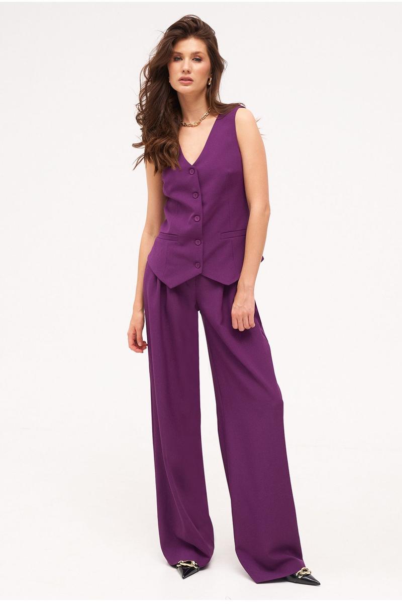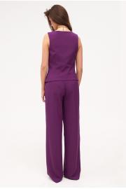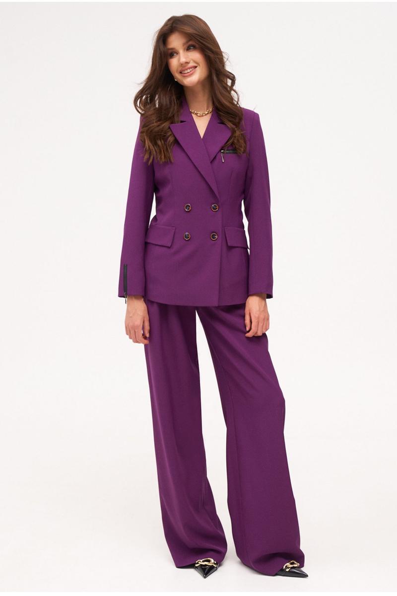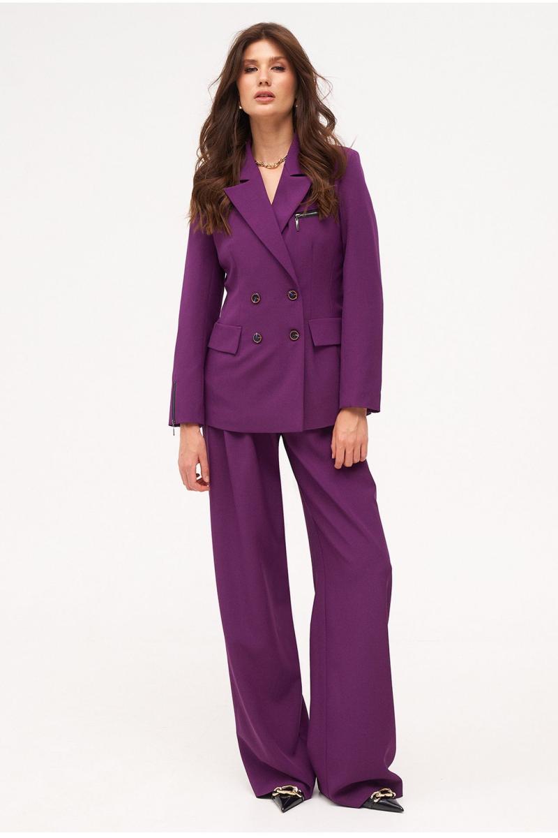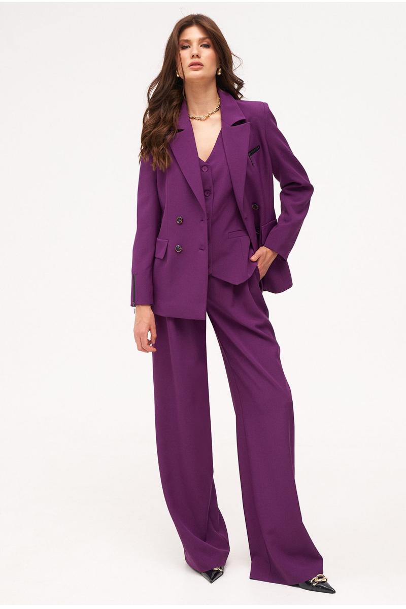 Женский костюм 3-ка, состоящий из жакета, жилета и брюк. Двубортный жакет полуприлегающего силуэта с декоративными элементами в виде молнии со входом в карман на груди и молнией по низу рукава. По переду два настрочных клапана. Сзади шлица. Жилетка женская умеренного объема полуприлегающего силуэта. Перед с талиевыми вытачками и имитацией карманов с листочкой. Спинка с талиевыми вытачками. Жилетка на притачной подкладке. Застежка центральная, на прорезные петли и пуговицы. Длина жилетки до уровня линии бедер. Брюки-палаццо прямого силуэта. На передних половинках брюк по линии талии заложены две односторонние складки, направленные в сторону бокового шва и функциональные карманы с отрезным бочком. На задних половинках находятся по две талиевые вытачки. Пояс отрезной, притачной, с уступом на правой передней половинке. На поясе шлевки. Верхний край пояса расположен на естественной линии талии. Застежка брюк – классический гульфик. Застежка пояса на две пуговицы и две петли. Длина брюк в пол. Длина брюк по боковому шву с поясом - 118 см