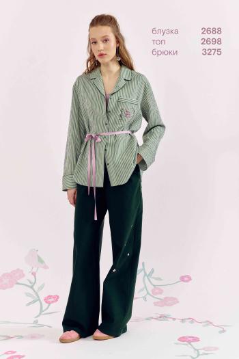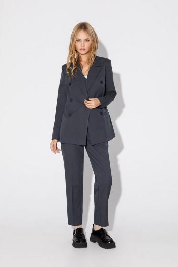 Брюки прямые широкие. По переду заложены 2 складки. В боковых подрезах функциональные карманы. Застежка гульфик-молния. Пояс притачной, застегивающийся на петлю и пуговицу, сзади присобран на резинку. Костюм без подкладки. Фурнитура может незначительно отличаться от фото.