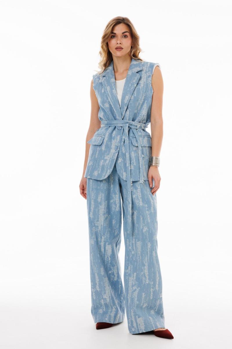 Стильный гармоничный комплект, состоящий из жилета с обработкой проймы открытым срезом и свободных брюк в стиле палаццо. Жилет прямого свободного силуэта на контрастной подкладке. Пройма рукавов обработана современным приемом: открытым срезом и зафиксирована дополнительной строчкой в качестве отделки. Английский отложной на стойке воротник, застежка однобортная фронтальная петли/пуговицы в области линии талии, с закругленными бортами. На полочке расположены горизонтальные прорезные фигурные карманы с клапаном. Спинка жакета имеет средний шов. Детали кроя имеют рельефный бочок для удачной посадки изделия. Длина изделия по среднему шву спинки 71-73 см в зависимости от размерного ряда. Брюки комплекта созданы в свободном стиле палаццо. В пояс брюк по спинке вставлена эластичная тесьма шириной 3 см. Спереди пояс фиксируется горизонтально на петли/пуговицы и вертикальную закрытую клапан-молнию (гульфик). При желании в пояс можно вставить ремень, так как имеются шлевочные держатели. В боковых швах: карманы с наклонным входом, на поясной линии талии расположены две неглубокие складки для свободы движения. Длина брюк по боковому шву 105-107 см в зависимости от размерного ряда. Дополнительно в комплекте присутствует текстильный пояс. (фурнитура может отличаться от представленной на рекламном фотоматериале) Особые рекомендации: рекомендуется холодная деликатная ручная стирка, без использования отбеливающих СМС, без интенсивного трения. Сушка в вертикальном положении. ВТО с минимальным паром.