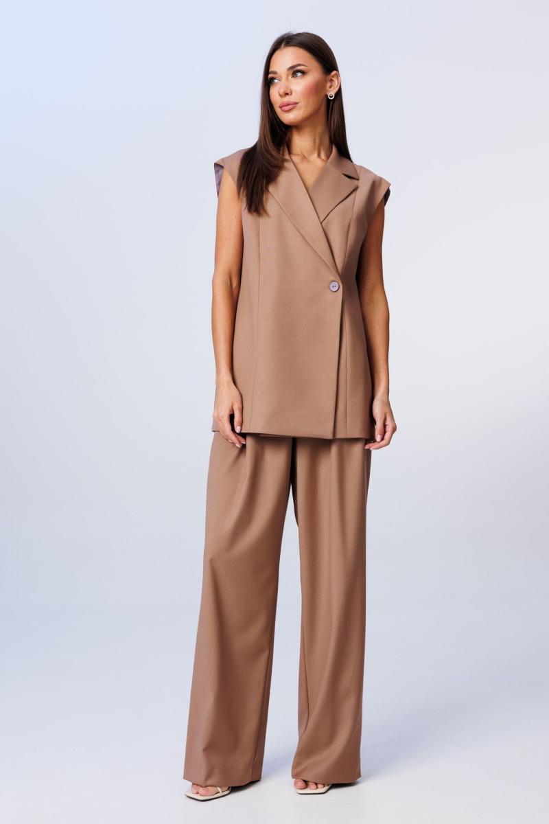 Стильный гармоничный комплект, состоящий из двубортного жилета и свободных брюк в стиле палаццо. Жилет двубортный прямого свободного силуэта в стиле oversize на подкладке. Линия плеча слегка спущена 16 см. Изделие состоит из вертикальных рельефных деталей на полочке и спинке. Горловина оформлена английским отложным воротником с лацканами, застежка двубортная фронтальная петли/пуговицы в области чуть выше линии талии. Длина изделия по среднему шву спинки 73-75 см (в зависимости от размерного ряда). Брюки комплекта созданы в свободном стиле палаццо. В пояс брюк по спинке вставлена эластичная тесьма, шириной 3 см. Спереди пояс фиксируется горизонтально на петли/пуговицы и вертикалную закрытую клапан-молнию (гульфик). При желании в пояс можно вставить ремень, так как имеются шлевочные держатели. В боковых швах: карманы с наклонным входом, на поясной линии талии расположены две неглубокие складки для свободы движения. Длина брюк по боковому шву 105-107 см (в зависимости от размерного ряда). (фурнитура может отличаться от представленной на рекламном фотоматериале) Особые рекомендации: рекомендуется холодная деликатная ручная стирка, без использования отбеливающих СМС, без интенсивного трения. Сушка в вертикальном положении. ВТО с минимальным паром.