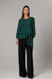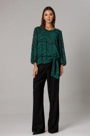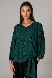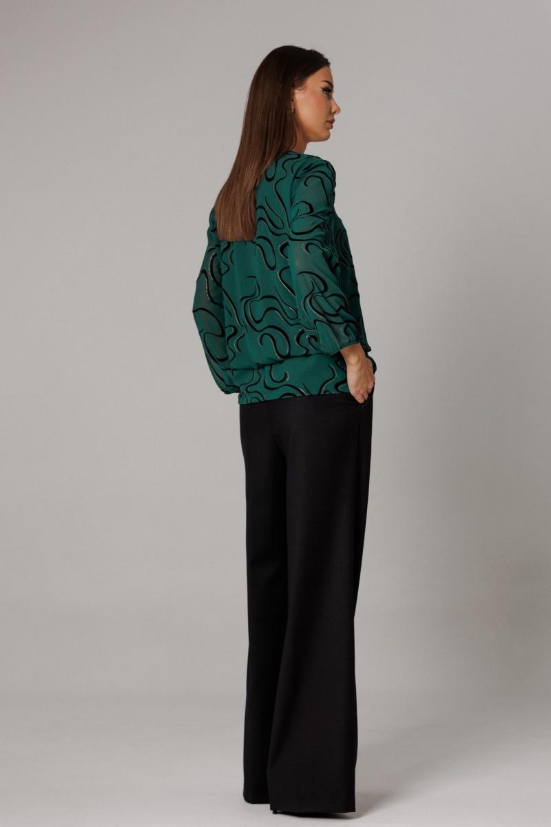 Блуза прямого силуэта на подкладке с ассиметричным притачным поясом-баской, который переходит в ассиметричный спереди завязывающийся узел со свободными концами. Горловина оформлена V-образным вырезом. Рукав втачной, одношовный, длиной 7/8 (51 см). По низу рукава и линии притачного пояса проложена эластичная тесьма для легкой сборки. Длина блузона по спинке с притачным поясом-баской 61 см. Брюки комплекта созданы в свободном стиле. Силуэт брюк имеет фигурное незначительное расширение к низу изделия. В пояс брюк по спинке вставлена эластичная тесьма, шириной 3 см. Спереди пояс фиксируется горизонтально на петли/пуговицы и вертикалную закрытую клапан-молнию (гульфик). При желании в пояс можно вставить ремень, так как имеются шлевочные держатели. В боковых швах: карманы с наклонным входом. На поясной линии талии переда расположена неглубокая складка для свободы движения, на задних полотнищах линии талии: вытачки. Длина брюк по боковому шву 108 см (без учета высоты пояса). (фурнитура может отличаться от представленной на рекламном фотоматериале)