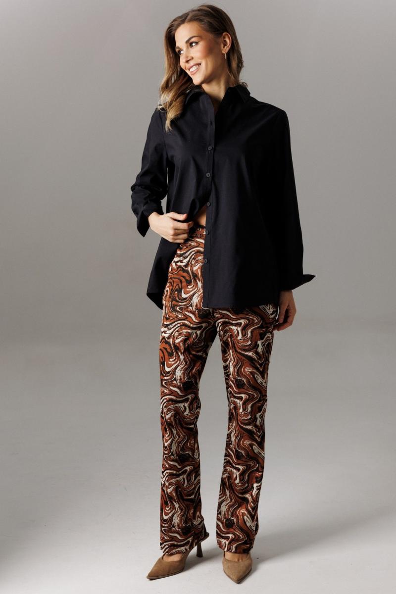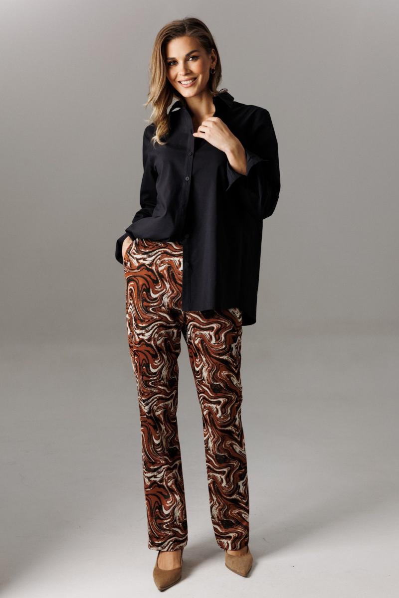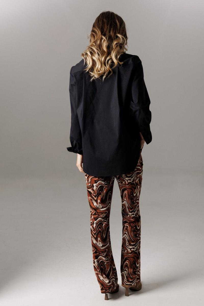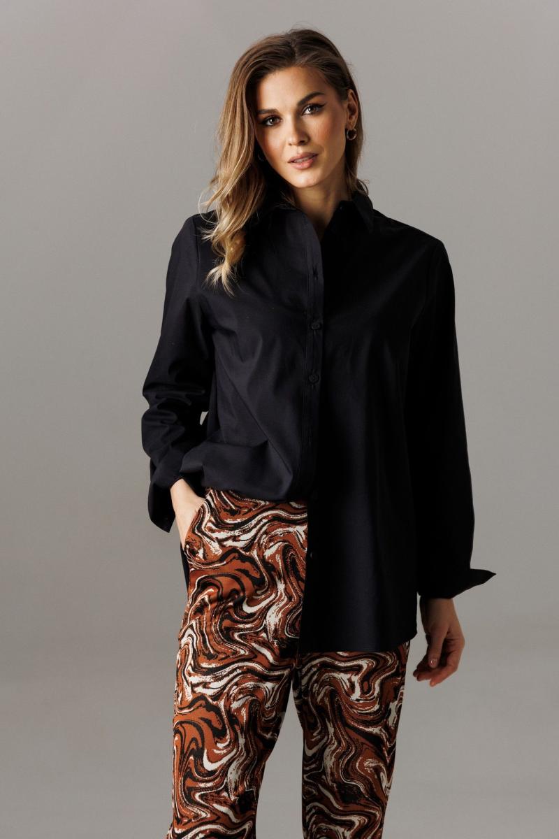Блуза прямого свободного силуэта с рубашечным воротником на стойке и зауженным рукавом на манжете со спущенной линией плеча. Спереди на функциональной планке петли/ пуговицы. Спинка изделия имеет горизонтальную плечевую кокетку (высота кокетки 20 см) и встречную складку для свободы движения. По плечевому шву заложена складка. Низ блузона слегка фигурный: спинка и полочка чуть длиннее бокового шва. Длина изделия блузона по спинке 73 см. Рукав рубашечный одношовный завершается манжетой (высота 5 см) с застежкой петля/пуговица. Длина спущенного плечевого шва 33 см. Длина рукава с манжетой 41 см. Брюки свободного покроя с эластичной тесьмой на поясе. К низу имеют незначительное расклешение. Ширина низа брюк 23 см (полуобхват). В центральной части пояса вставлен шнур для дополнительной фиксации талии. В боковых швах расположены косые внутренние карманы. Длина брюк по боковому шву 105 см.