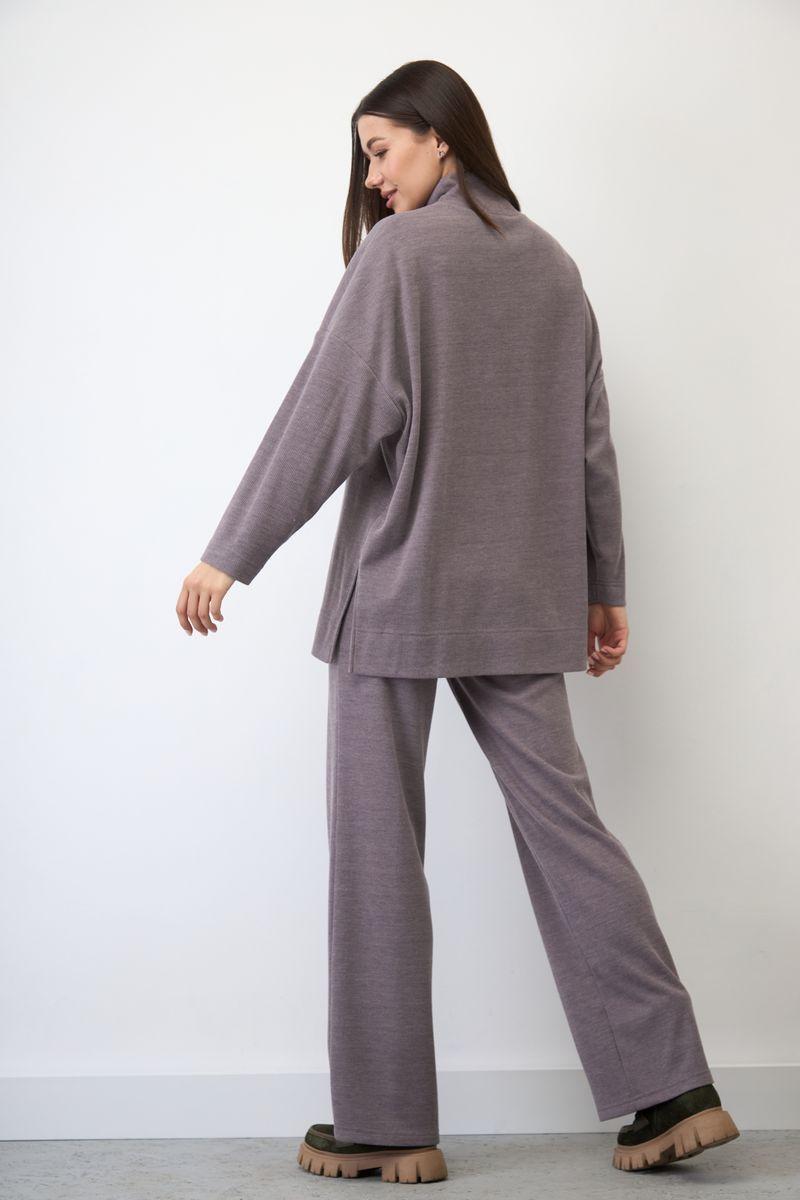 Комплект из уютного мягкого трикотажа, состоящий из свободного покроя оверсайз джемпера и широких свободных брюк. Джемпер имеет спущенную линию плеча, свободный рукав, зауженный к низу. Ширина рукава 22-24 см, запястья 15 см. Длина от линии горловины до запястья 72-74cm (B зависимости от размерного ряда). Боковые швы джемпера дополнены разрезами, высотой 15 см. Длина изделия по линии спинки 72-74 см(в зависимости от размерного ряда). Горловина джемпера оформлена стойкой с перегибом, высотой 8 см.