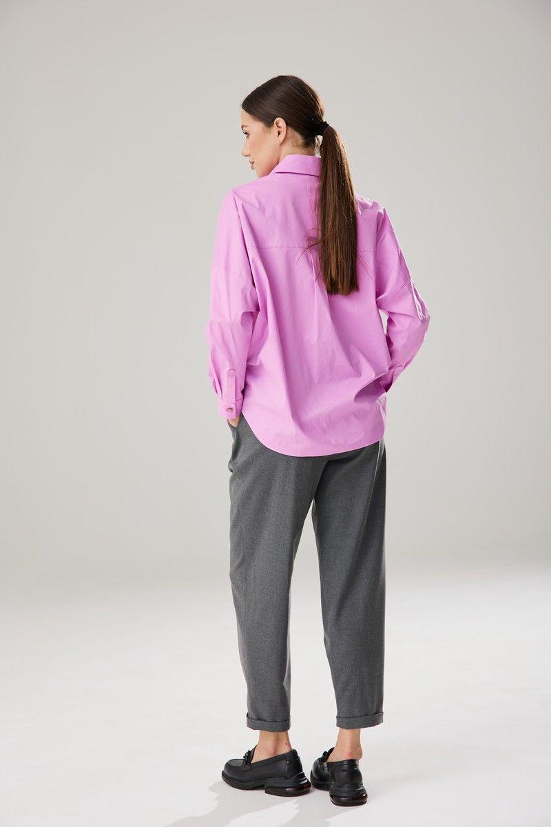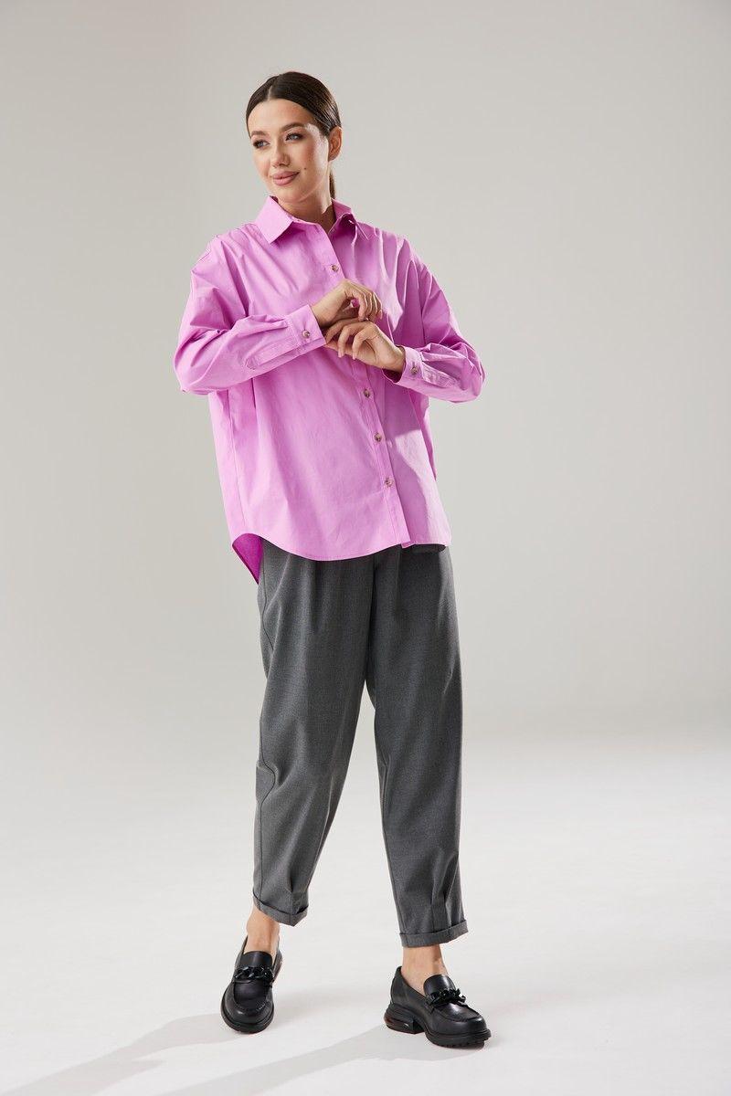 Стильный комплект, состоящий из рубашки оверсайз и свободных брюк Рубашка оверсайз прямого силуэта с рубашечным воротником на стойке и зауженным рукавом на манжете, со спущенной линией плеча. Спереди на функциональной планке петли/пуговицы. Спинка изделия имеет горизонтальную плечевую кокетку и встречную складку для свободы облегания. По плечевому шву заложена складка. Низ блузона слегка фигурный: спинка и полочка чуть длиннее бокового шва. Длина изделия блузона по спинке 72 см в размерах 44-48, в р.50-52 Длина изделия на 3 см больше. Длина спущенного плечевого шва 32 см. Длина рукава с манжетой 40 см. Брюки современного свободного силуэта с успешной посадкой на фигуре. Карманы-хулиганы расположены в боковых швах. На задней части брюк находится ложный карман-листочка. Фронтальная застежка на клапан-молнию (гульфик) и пуговицу. В пояс талии фрагментом вставлена эластичная тесьма для свободы обхвата. Для дополнительной фиксации талии спереди расположены полупояса с пряжкой-полукольцами. На талии переда, по центру, также находятся складки-защипы для свободы входа в карман. На передних полотнищах брюк внизу заложены 2 модельные складки для уменьшения ширины брюк по низу изделия. Оканчиваются брюки деликатным отворотом, шириной 2.5 см Длина брюк с отворотом по боковому шву-99 см. Ширина брюк низа-34см(в сложенном виде 17 см). Представленная фурнитура может отличаться от представленной на фото/видео материале. Особые рекомендации: рекомендуется холодная деликатная ручная стирка, без использования отбеливающих СМС, без интенсивного трения. Сушка в вертикальном положении. ВТО с минимальным паром.