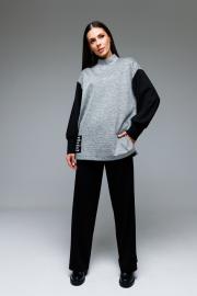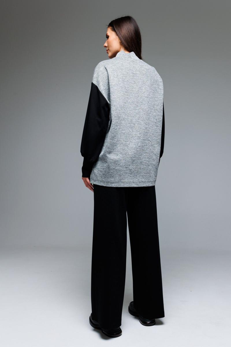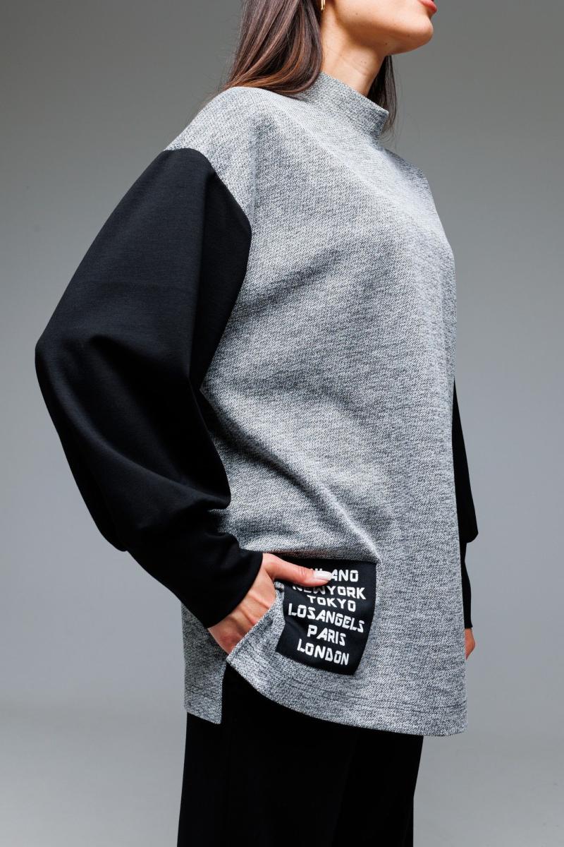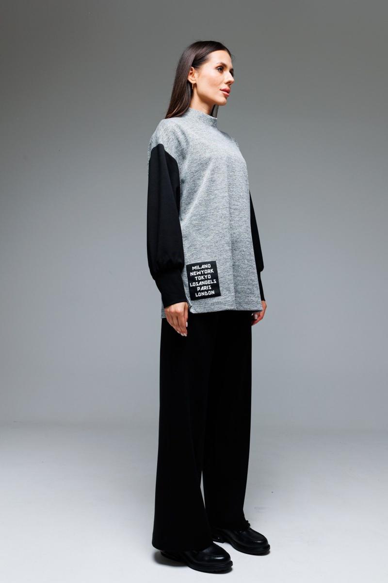 Блузон прямого силуэта, со спущенной линией плеча и втачным обьемным рукавом со сборкой на манжете, высотой 12 см. Горловина обработана эластичной стойкой, высотой 5 см. В боковых швах основы блузона предусмотрены разрезы. В качестве декоративного элемента, в нижней части блузона расположена этикетная деталь. Длина изделия по спинке 70 см.