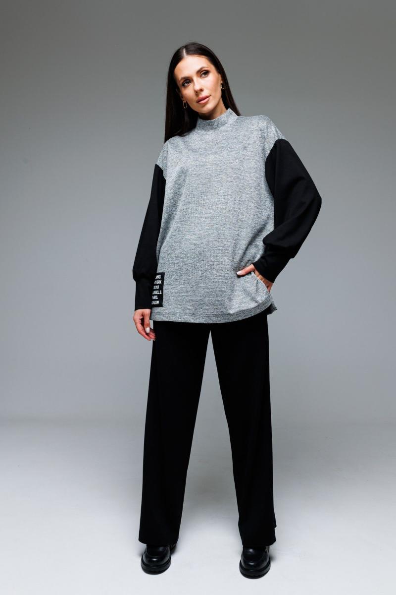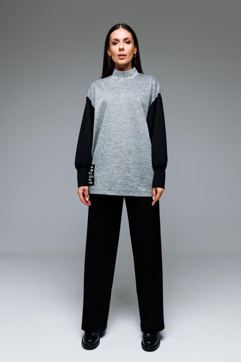 Стильный комплект, состоящий из удлиненного прямого блузона и прямых свободных брюк.