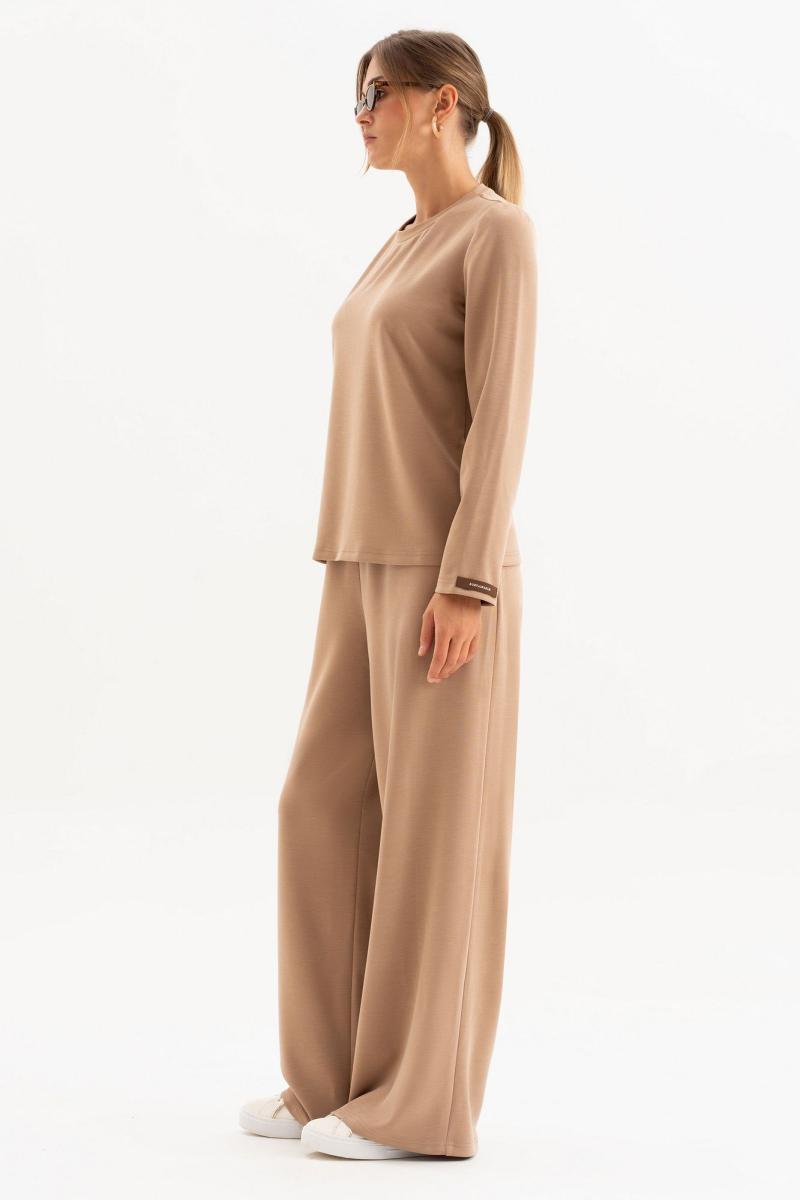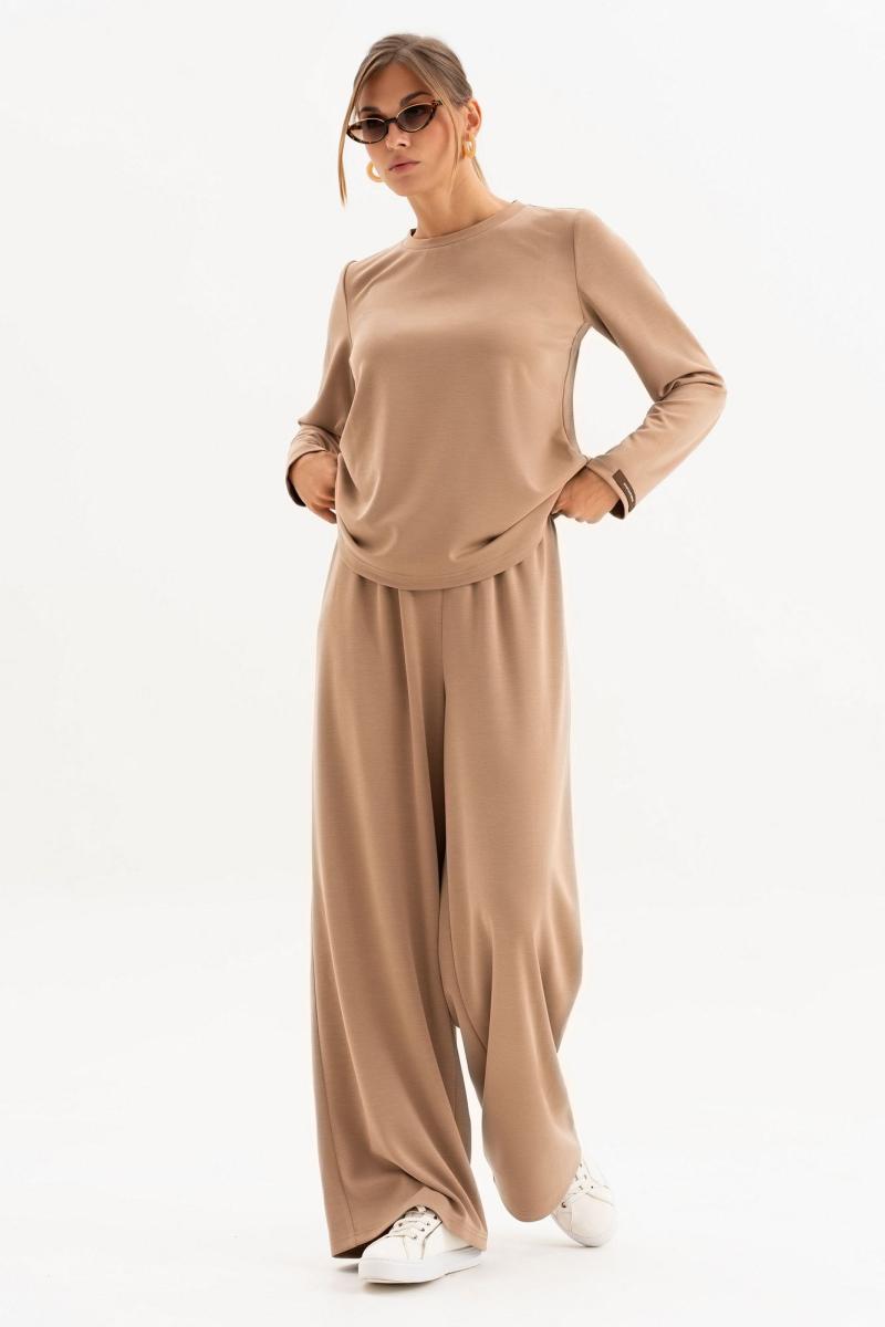 Женский костюм из трикотажного полотна с вискозой подходит для создания базового кэжуал образа,отлично комбинируется с жилетом( М-254,М-228),кроссовками и бейсболкой.Лонгслив прямого силуэта с округлой горловиной,длинными рукавами и нашивкой.Комфортные широкие брюки с высокой посадкой на резинке по талии. длина лонгслива-61см,дл.рукава-61 см