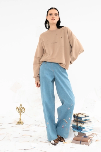 Модель оверсайз прямого силуэта с округлым вырезом горловины и расширенной линией плеч. Плечевые вытачки на переде и спинке. Длинные объемные рукава с фигурными подрезами, декорированными кантом, и манжетами из кашкорсе. По низу изделия — кулиска с эластичным шнуром и фиксаторами. Длина свитшота ниже бедер: 71 см по спинке, длина рукава — 77 см.