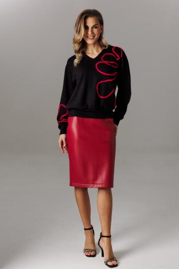 Комплект двух-предметный, состоит из брюк и кофты. Брюки выполнены из текстиля (стрейч), с завышенной линией талии, верхний срез на обтачке, застежка на тесьму- молнию. Также на переднем и заднем полотнище выполнены вытачки, брюки к низу заужены. Кофта выполнена из трикотажного полотна, Горловина имеет V-образный вырез, обработана широкой стойкой с застежкой на пуговицы. Низ кофты на планке с резинкой. Рукав свободного покроя, на спущенной пройме, низ рукава на манжете, декорированной пуговицей. Стильный и универсальный комплект отлично подойдет для вашего весеннего образа.