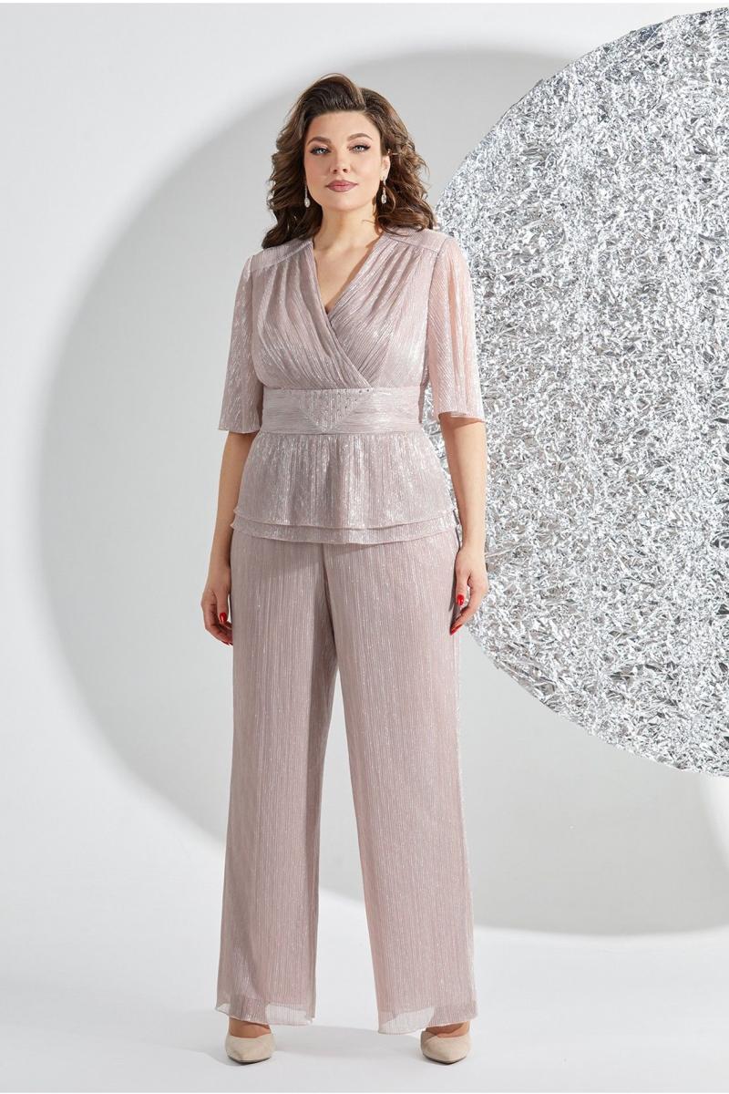 Стильный, женский комплект состоит из блузы и брюк, полу-прилегающего силуэта. Блуза выполнена из плиссированной ткани, на трикотажной подкладке. Вырез горловины V-образной формы, по линии плеча обработаны кокетки, от кокетки вниз по лифу выполнена сборка. По линии талии подрез с фигурной вставкой из основной ткани, декорированной стразами, от линии талии двойная баска из плиссировки. Спинка с подрезом по линии талии, в подрез вставлена резинка для более хорошего прилегания. Рукав втачной, расклешенный к низу оптимальной длины. Брюки выполнены из плиссированной ткани, на подкладке, верхний срез с притачным поясом на резинке. Эффектный, нарядный комплект отличный выбор для комфортного и стильного образа.