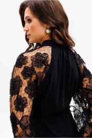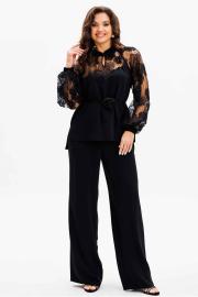 Костюм женский свободного силуэта состоит из блузы и брюк. Блуза, комбинированная из двух различных по фактуре тканей. По горловине застежка на крючек. Боковые швы заканчиваются небольшими разрезами. Воротник стойка. Рукава реглан, низ на резинке. Брюки палаццо, на притачном поясе с резинкой и тесьмой. У брюк - боковые карманы.