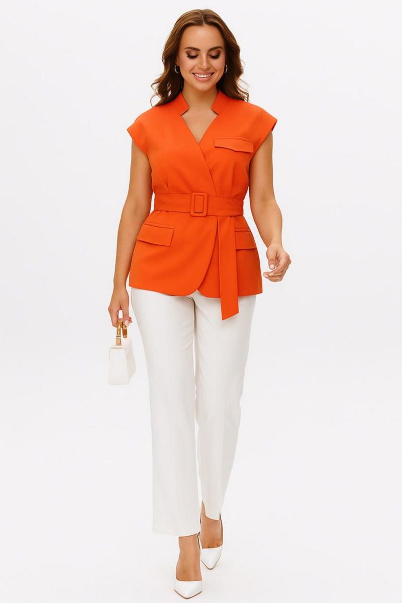 Костюм женский, состоящий из жилета и брюк. Жилет полуприлегающего силуэта, без подкладки. Плечо спущенное.Вырез V - образный, с воротником стойкой. по переду иммитация карманов с клапаном. Центральная застежка на пришивные кнопки. Спинка со средним швом и вытачками. Брюки женские с высокой посадкой на притачном поясе зауженные к низу. По переду прорезные карманы с листочкой, и застёжка молния с гульфиком и откоском. Пояс по спинке на резинке, застёгиваются брюки на крючок.