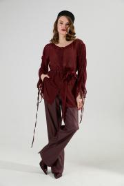 Костюм двухпредметный: состоит из блуза и брюк. Блуза прямого кроя с центральной застёжкой на петли и пуговицы. Вырез горловины глубокий округлый. Линия плеча приспущена. На рукавах изделия заложена декоративная сборка с регулируемыми завязками. В комплект к изделию идёт узкий пояс из основной ткани с авторским украшением ручной работы. Брюки свободного кроя, верхний срез представлен широкой резинкой, с карманами.