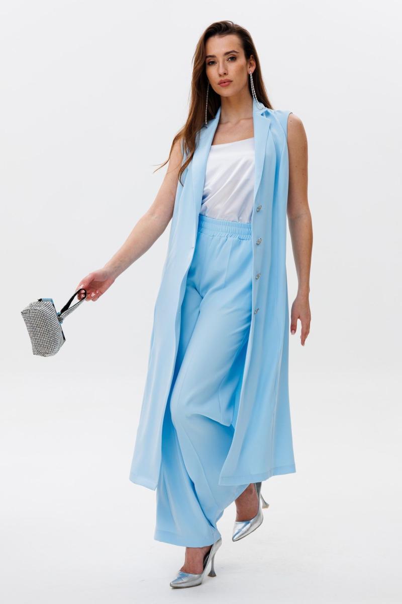 Костюм трехпредметный: состоит из топа, жилета-платья и брюк. Жилет удлиненный полуприлегающей силуэтной формы без рукавов. Полочка со смещённым бортовым краем назапах, с рельефными швами от линии плеча до низа. Застежка на петли и пуговицы. Спинка со средним швом и талиевыми вытачками. Воротник отложной с отрезной стойкой . Топ на регулируемых бретелях с полукруглым вырезом. Брюки свободного кроя, верхний срез представлен широкой резинкой, с карманами.