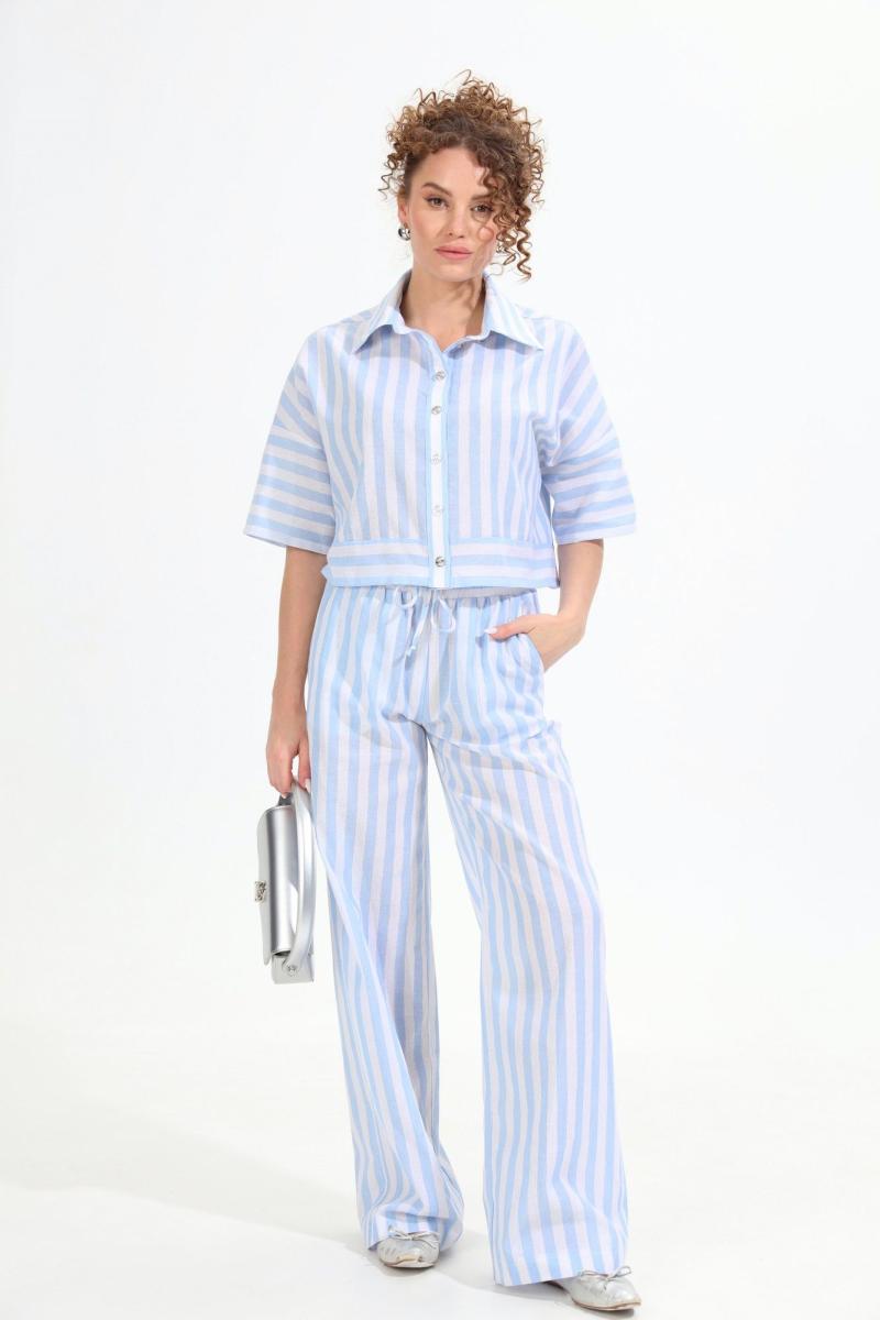 Костюм двухпредметный: состоит из рубашки и брюк. Рубашка укороченная прямого силуэта с притачной планкой с застёжкой на петли и пуговицы. Рукав короткий одношовный со спущенной линией плеча. Воротник рубашечный стояче-отложной. Брюки свободного кроя сочетают элегантность и комфорт. Широкая резинка на поясе с завязками и наличие функциональных карманов подчеркивают удобство модели.