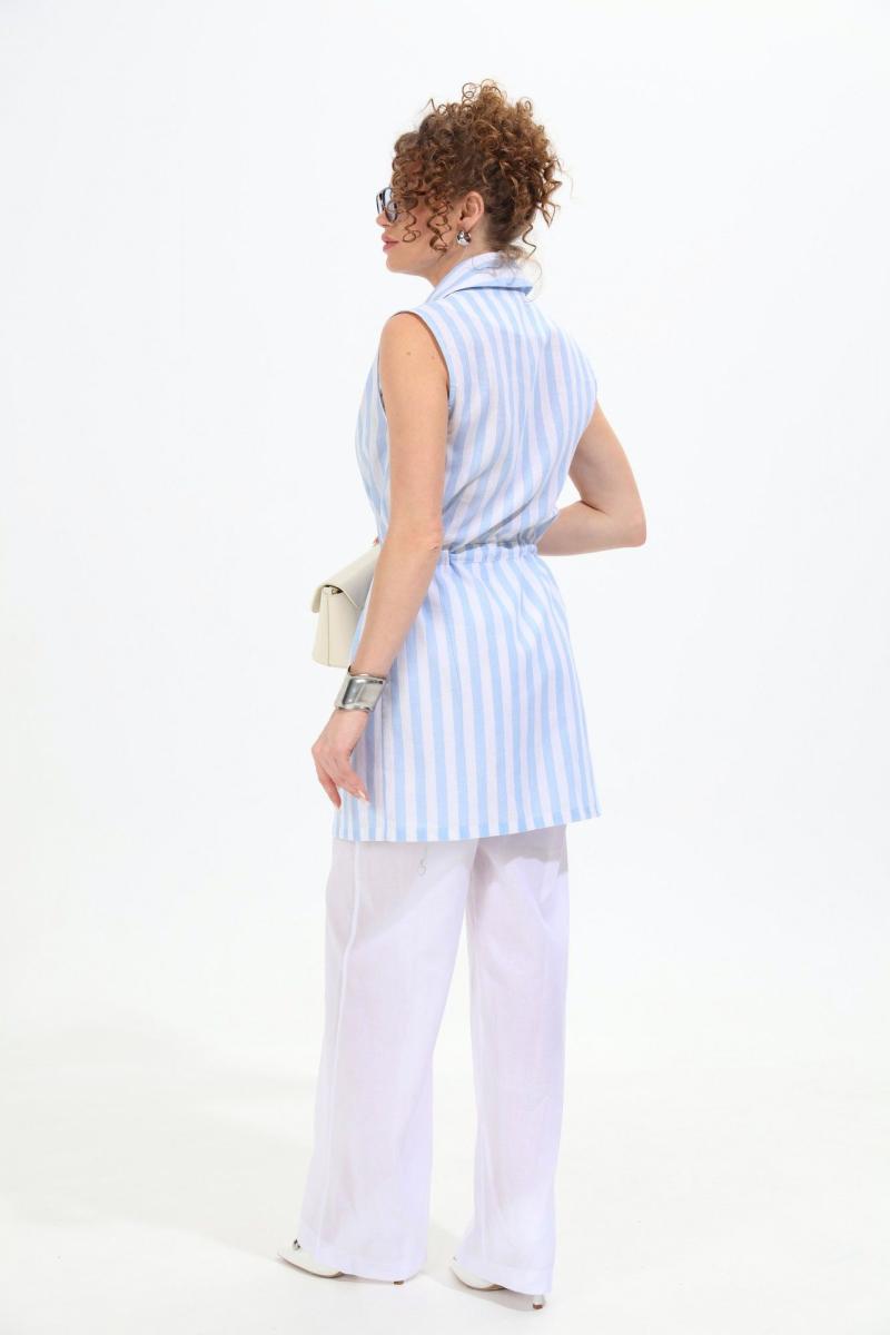 Костюм двухпредметный: состоит из жилета и брюк. Жилет удлиненный прямого силуэта, воротник пиджачного типа. По линии ткани настрочная кулиса с завязками. Застежка центрально-бортовая на петлю и пуговицу. Брюки свободного кроя сочетают элегантность и комфорт. Широкая резинка на поясе с завязками и наличие функциональных карманов подчеркивают удобство модели.