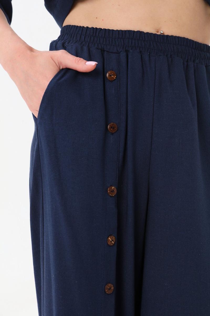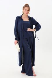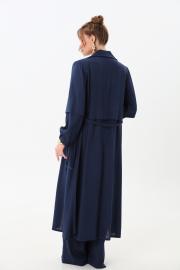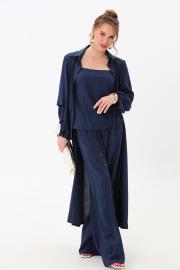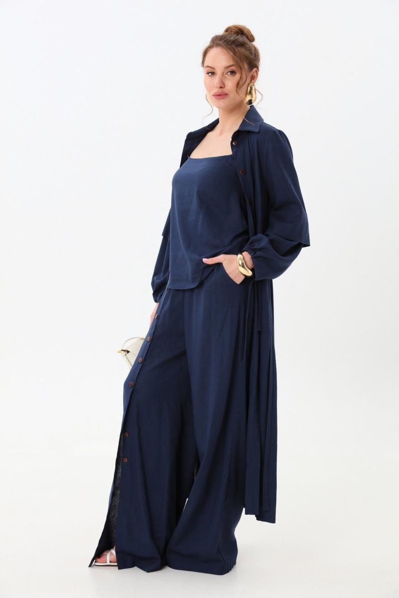 Костюм трехпредметный: состоит из кардигана-платья, брюк и топа. Платье-кардиган макси с центральной отрезной застёжкой на потайную планку на петли и пуговицы.По переду и спинке цельнокроеные складки на уровне талии. Рукав втачной,одношовный рубашечноно типа. По низу рукава пробиты петли и вставлена завязка для фиксации сборки . Воротник рубашечный стояче отложной. В комплект к изделию идёт пояс из основной ткани для максимально комфортного регулирования объёма. Брюки свободного кроя, верхний срез представлен широкой резинкой, с карманами. По центру правой брючины расположена планка с функционирующими петлями и пуговицами. Топ на тонких регулируемых бретелях.