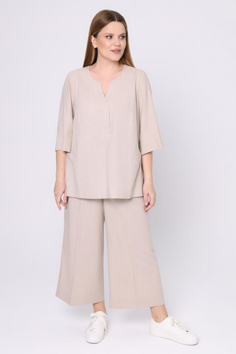 58 Блузка: Длина изделия от высшей плечевой точки до низа - 74см, Длина переда от высшей плечевой точки до низа - 69см, Длина рукава - 39см, Ширина плеча - 12см, Ширина по груди - 67см, Ширина по низу - 68см, Ширина рукава - 22см; Брюки: Высота посадки - 29,5см, Длина брюк с поясом - 90см, Длина по внутреннему шву - 62см, Ширина брючин сверху - 82см, Обхват брюк по низу - 72см, Ширина по бедрам - 66см, Ширина по талии - 49см;