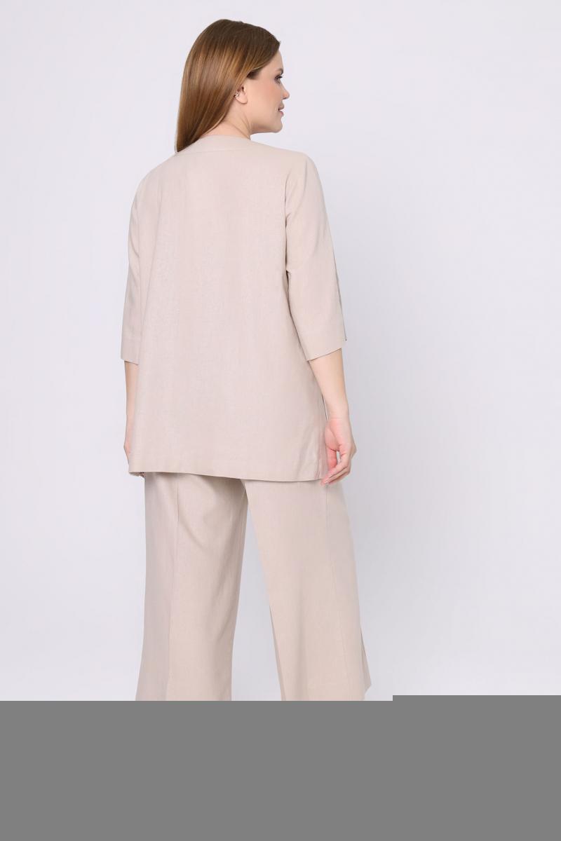 56 Блузка: Длина изделия от высшей плечевой точки до низа - 74см, Длина переда от высшей плечевой точки до низа - 69см, Длина рукава - 39см, Ширина плеча - 12см, Ширина по груди - 65см, Ширина по низу - 66см, Ширина рукава - 21,5см; Брюки: Высота посадки - 29см, Длина брюк с поясом - 90см, Длина по внутреннему шву - 62см, Ширина брючин сверху - 80см, Обхват брюк по низу - 71см, Ширина по бедрам - 63см, Ширина по талии - 47см;
