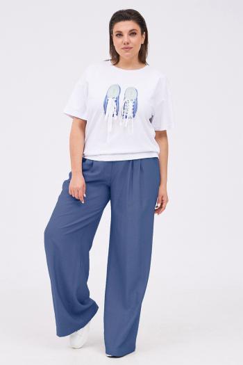 Текстильный костюм-двойка из свободного жакета и укороченных брюк с резинкой по поясу. Детали: жакет прямого силуэта, пиджачный воротник, перед с прорезными функциональными карманами, нагрудный декоративный карман, однобортная застежка на петли и пуговицы, спинка со средним швом, рукава втачные двухшовные с разрезами по низу, жакет на подкладке. Брюки с высокой посадкой, притачной пояс со шлевками, задняя часть пояса эластичная- с резинкой, застежка на молнию и пуговицу, боковые карманы, передние половины с двумя складками.