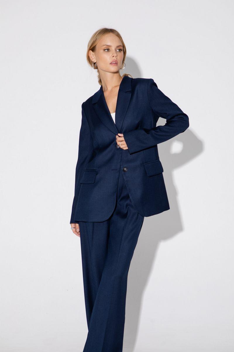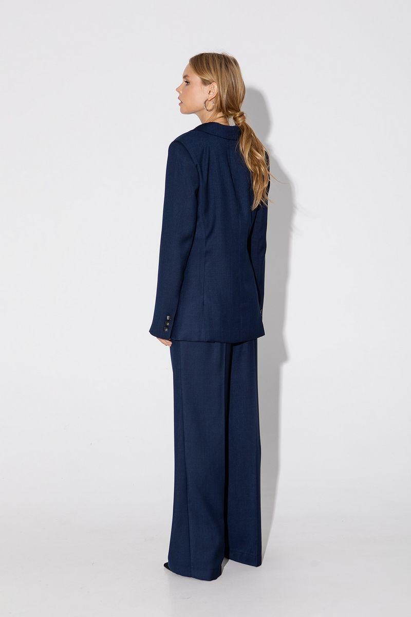 Текстильный костюм-двойка из свободного жакета со шлицами и широких прямых брюк. Детали: жакет полуприлегающего силуэта, талиевые вытачки, пиджачный воротник, застежка на две петли и пуговицы, функциональные карманы, рукава и спинка со шлицами, жакет на подкладке. Брюки с высокой посадкой на притачном поясе со шлевками, застежка на молнию и пуговицу, боковые карманы, передние половины с заутюженными стрелками и двумя небольшими складками.