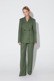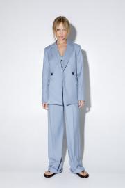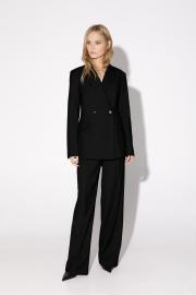 Текстильный костюм-тройка из двубортного полуприлегающего жакета, жилета и прямых брюк со стрелками. Детали: жакет с отрезными бочками и нагрудными вытачками, пиджачный воротник, прорезные карманы, застежка на петли и пуговицы, спинка со средним швом, втачные двухшовные рукава, жакет на подкладке. Жилет полуприлегающего силуэта, талиевые вытачками, застежка на петли и пуговицы, функциональные карманы, фигурный низ, на подкладке. Брюки с высокой посадкой на притачном поясе со шлевками, передние половины с небольшими застроченными мягкими складками и заутюженными стрелками, застежка на молнию и пуговицу, боковые карманы. Длина жакета по спинке около 68/71 см, длина рукава около 61 см. Длина жилета по спинке около 48,5/51,5 см. Длина брюк по боковому шву с поясом около 113/114,5 см.
