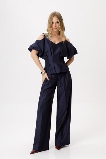 Текстильный костюм-двойка из оверсайз жакета и прямых брюк-палаццо со стрелками. Детали: жакет прямого силуэта, расширенная линия плеч, пиджачный воротник, перед с прорезными функциональными карманами, однобортная застежка на петли и пуговицы, спинка со средним швом и шлицей, рукава втачные двухшовные, жакет на подкладке. Брюки с высокой посадкой на притачном поясе со шлевками, застежка на молнию и пуговицу, боковые карманы, передние половины с заутюженными стрелками и двумя небольшими складками. Длина жакета по спинке около 69 см в размерах 40-46 и около 72 см в размерах 48-52, длина рукавов около 62 см. Длина брюк по боковому шву с поясом около 113 см в размерах 40-46 и около 114,5 см в размерах 48-52, длина по внутреннему шву около 82 см.