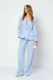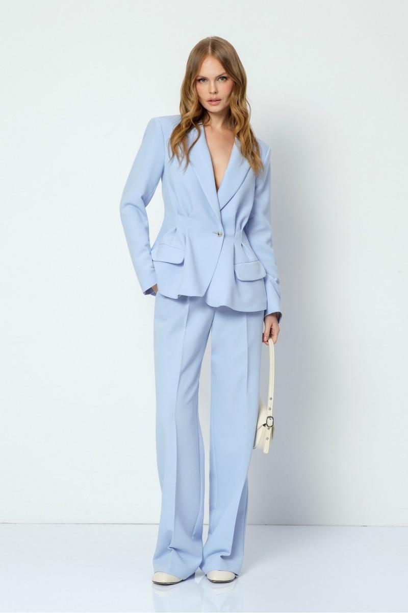 Текстильный костюм-двойка из укороченного приталенного жакета со складками и широких прямых брюк со стрелками.