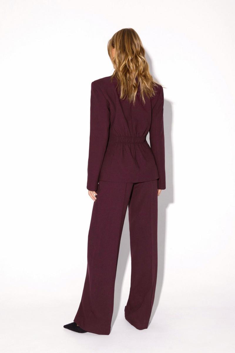 Текстильный костюм-двойка из укороченного приталенного жакета со складками и широких прямых брюк со стрелками. Детали: пиджачный воротник, перед с функциональными карманами, застежка на одну петлю и пуговицу, рукава втачные двухшовные, спинка с рельефами и резинкой по талии. Жакет на подкладке. Брюки с притачным поясом со шлевками, передние половины с небольшими застроченными мягкими складками и заутюженными стрелками, застежка на молнию и пуговицу, боковые карманы. Задние части брюк с вытачками и заутюженными стрелками. Пояс брюк прямой, без резинки. Длина жакета по спинке около 64 см в размерах 40-46 и около 67 см в размерах 48-52, длина рукава около 61 см. Длина брюк по боковому шву с поясом около 114 см в размерах 40-46 и около 115,5 см в размерах 48-52. Длина по внутреннему шву около 83 см