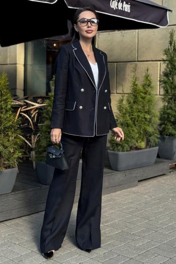Текстильный костюм-двойка из свободного жакета с декором и укороченных брюк со стрелками. Детали: жакет свободного покроя и полуприлегающего силуэта, двубортная застежка на петли и пуговицы, отрезные бочки, пиджачный воротник, функциональные карманы, жакет на подкладке, съемный пояс. Брюки с высокой посадкой на притачном поясе со шлевками, передние половины с небольшими застроченными мягкими складками и заутюженными стрелками, застежка на молнию и пуговицу, боковые карманы. Задние части брюк с вытачками и имитацией карманов. Длина жакета по спинке около 69 см в размерах 40-46 и около 72 см в размерах 48-52, длина рукавов около 62 см. Длина брюк по боковому шву с поясом около 99 см в размерах 40-46 и около 100,5 см в размерах 48-52, длина по внутреннему шву около 69,5 см