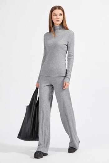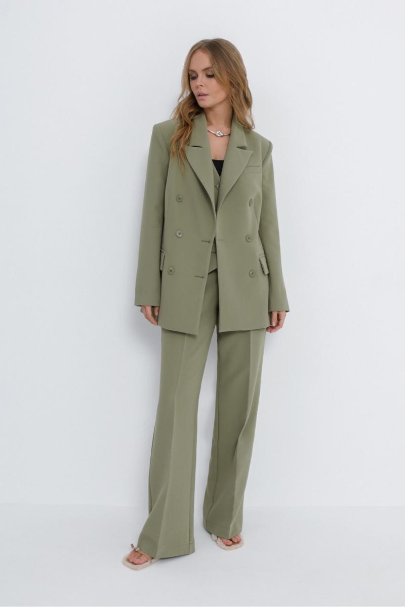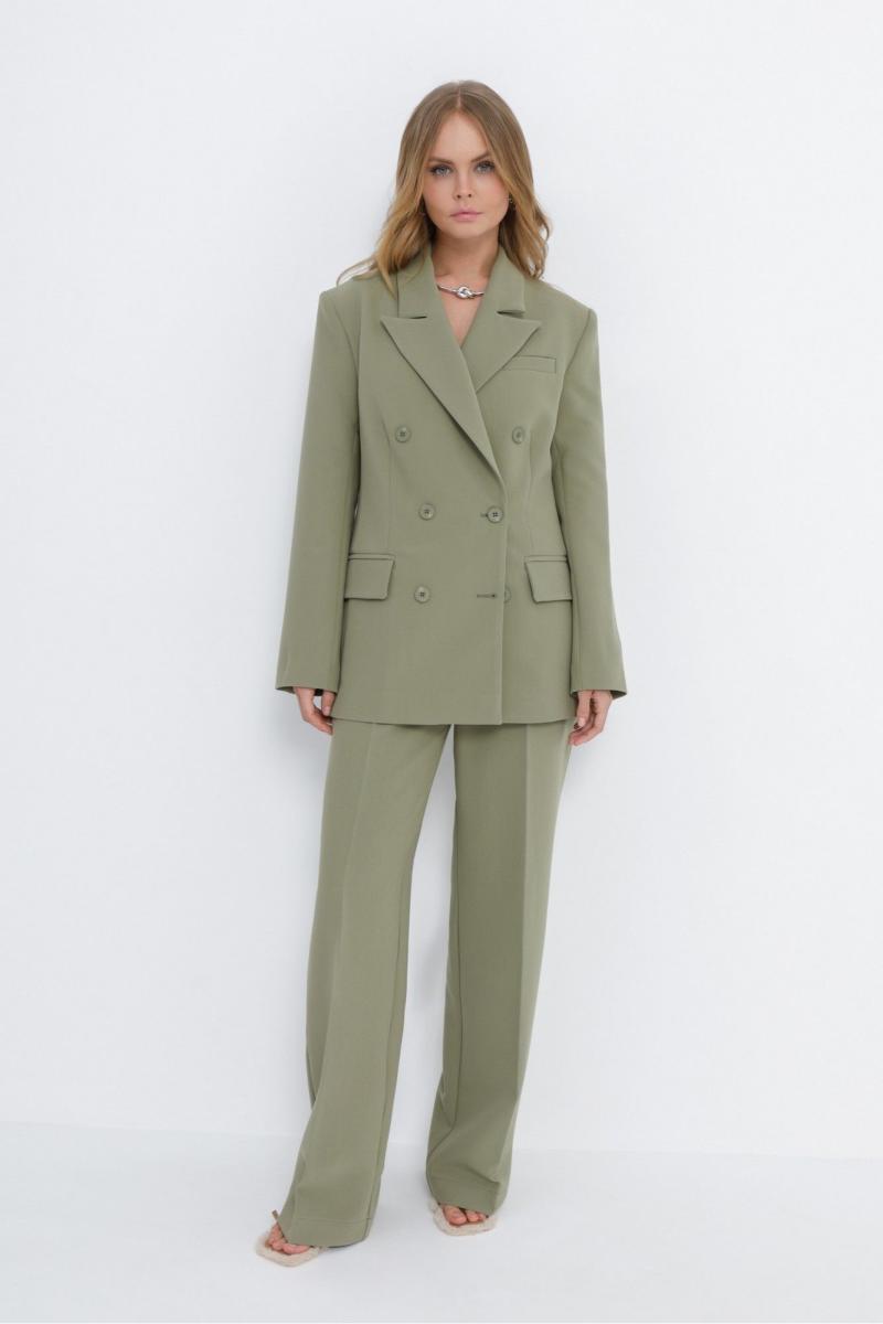 Текстильный костюм-двойка из свободного жакета и прямых широких брюк со стрелками. Детали: жакет свободного покроя и полуприлегающего силуэта, двубортная застежка на петли и пуговицы, отрезные бочки, пиджачный воротник, функциональные карманы, жакет на подкладке. Брюки с высокой посадкой, притачной пояс со шлевками, передние половины с небольшими застроченными мягкими складками и заутюженными стрелками, застежка на молнию и пуговицу, боковые карманы. Задние части брюк с вытачками и заутюженными стрелками. Пояс брюк прямой, без резинки. Длина жакета по спинке около 69 см в размерах 40-46 и около 72 см в размерах 48-52, длина рукавов около 62 см. Длина брюк по боковому шву с поясом около 114 в размерах 40-46 и около 115,5 см в размерах 48-52. Длина по внутреннему шву около 83 см